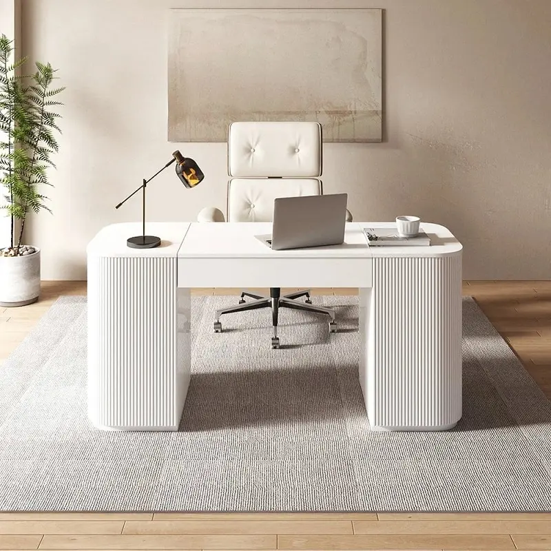 تم تصميم هذا المكتب بأسلوب هادئ وعملي، حيث يأتي باللون الأبيض الذي يمنح المكان اتساعاً وهدوءاً بصرياً، وينسجم بسهولة مع مختلف الديكورات العصرية.