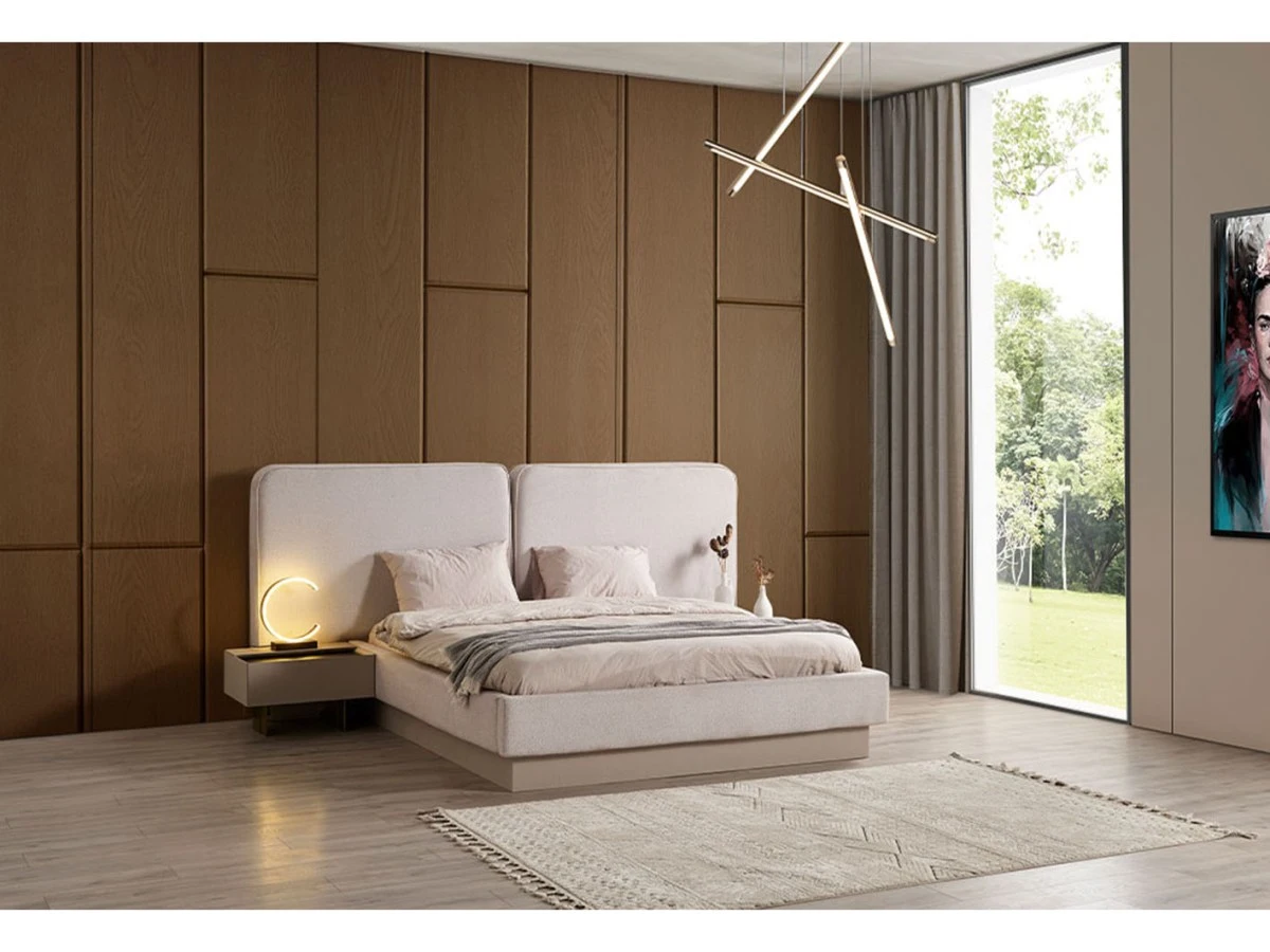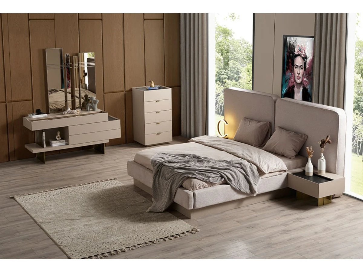 - يتضمن سريرًا مريحًا، دولابًا واسعًا، تسريحة أنيقة، وطاولة جانبية عملية، كل ذلك بتناسق مثالي.