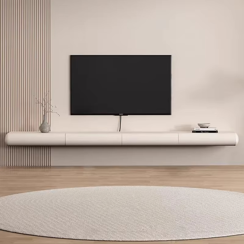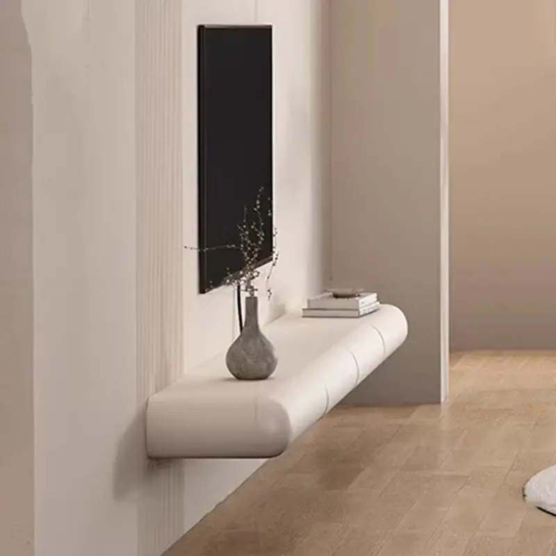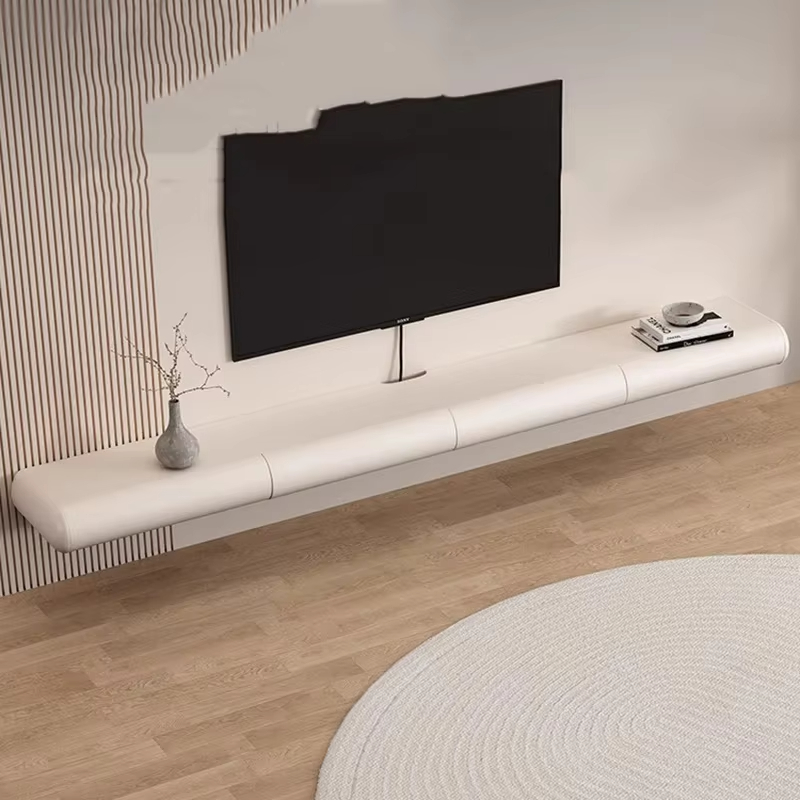 رف تلفزيون معلق بتصميم معلق عصري يمنح الجدار مظهر أنيق وانسيابي.