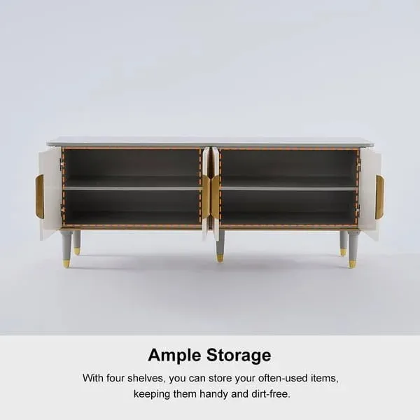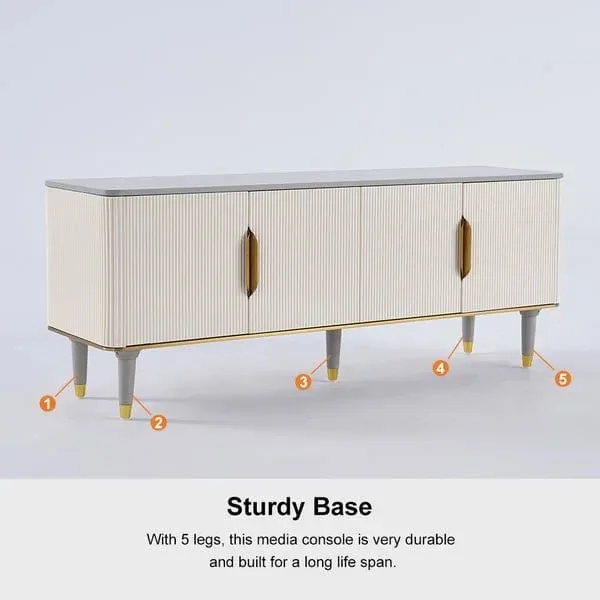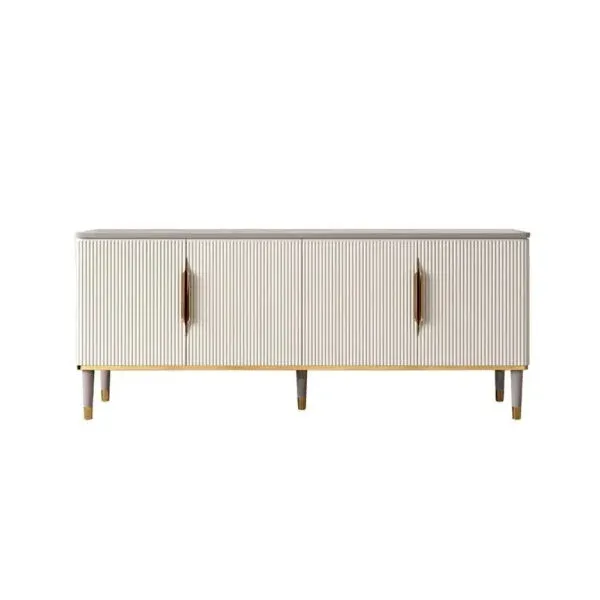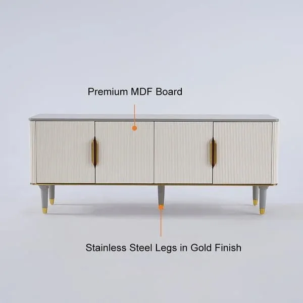 طاولة تلفاز بتصميم عصري فاخر وتفاصيل مموجة تمنح المكان طابعًا أنيقًا. يوفر تخزينًا واسعًا خلف الأبواب مع أرفف داخلية لتنظيم ملحقات الوسائط والكتب والزينة، مع فراغ سفلي يساعد على سهولة التنظيف اليومي.