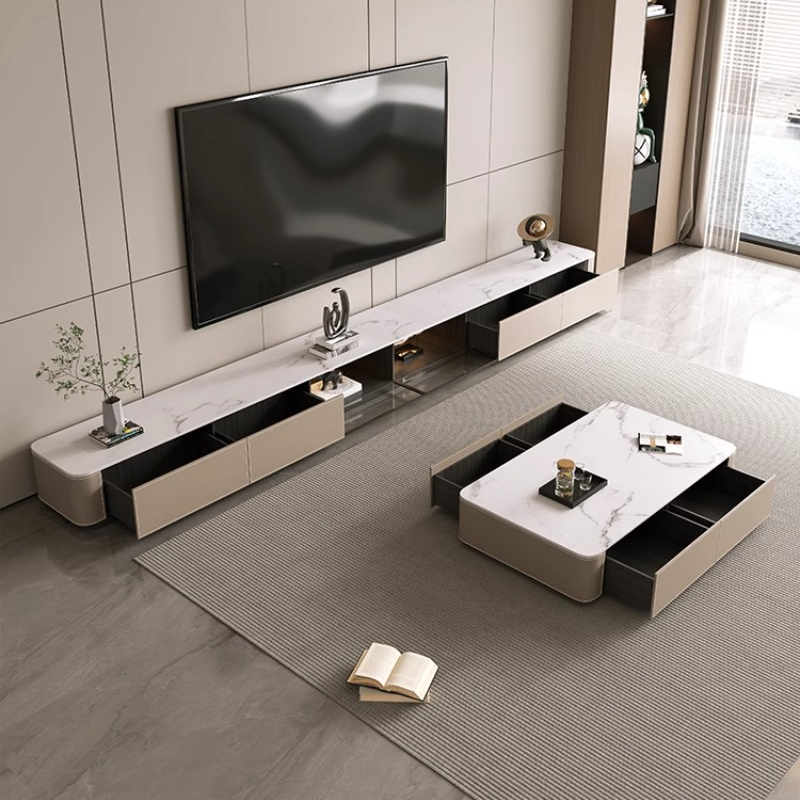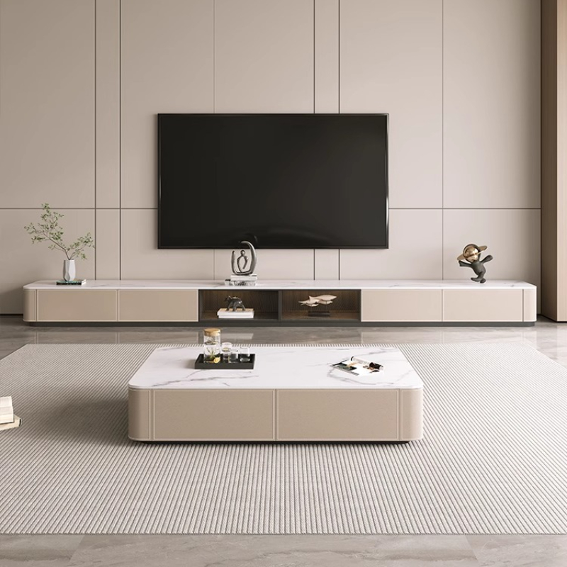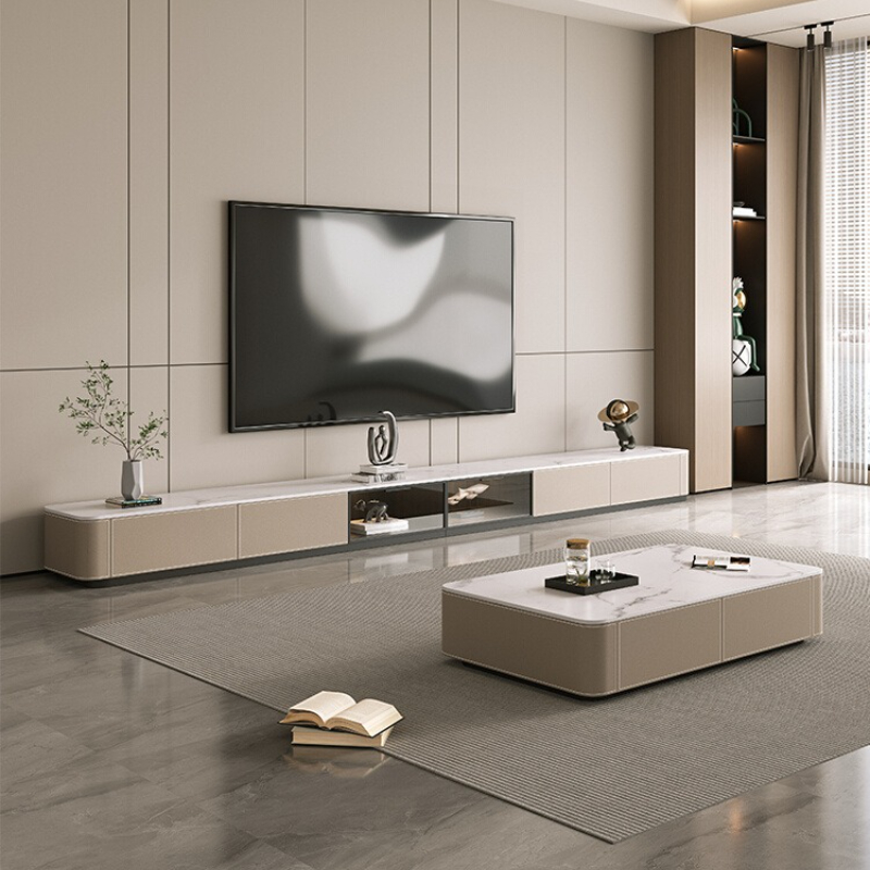 طاولة تلفاز مصممة بذوق راقٍ وجودة عالية، مصنوعة من خشب زان متين عالي الجودة ومغطاة بجلد أنيق، مع سطح رخامي فاخر، تتوفر بعدة مقاسات وتُناسب المساحات الواسعة في المنازل الخليجية.