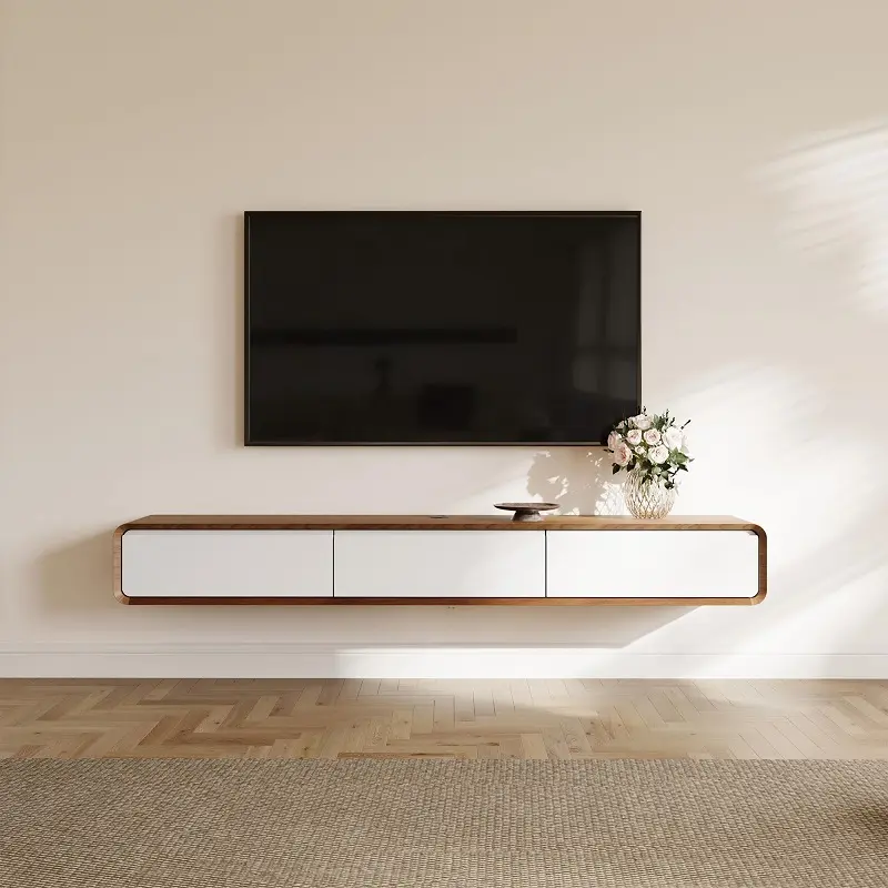 طاولة تلفاز بتصميم أنيق معلق على الجدار، مصنوعة من خشب زان متين عالي الجودة، متوفرة بعدة ألوان مميزة ومقاسات مدروسة لتمنح منزلك لمسة عصرية مرتبة.