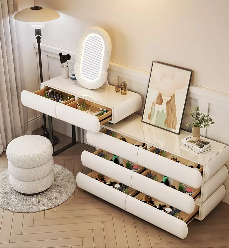 تتميز طاولة تسريحة بجودة التصنيع العالية، حيث تم استخدام خشب هندسي متين وخشب زان روماني فاخر في تصميم الهيكل، مما يضمن المتانة وطول العمر. كما تأتي بقاعدة معدنية متينة تضيف لها مزيدًا من الثبات والأناقة.