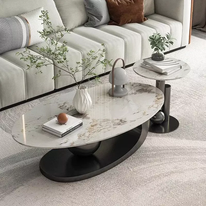 طقم طاولات قهوة على شكل بيضاوي لإضافة لمسة أنيقة إلى غرفة المعيشة. مصمم بهيكل معدني قوي وسطح رخامي عالي الجودة، يضمن المتانة والفخامة. الطاولات تتوفر بمقاسات متعددة لتناسب احتياجاتك المختلفة: 120 سم، 130 سم، 140 سم، وطاولة صغيرة بحجم 50 سم. يتميز المنتج بتصميم متعدد الألوان، ويأتي مع ضمان لمدة سنتين ضد عيوب التصنيع. كود المنتج: MR4513. تنظيف سهل بمسحة رقيقة عند الحاجة.