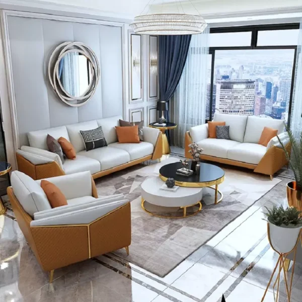 طقم كنب يتكون من كنبة ثنائية + كنبة ثلاثية + كرسي مفرد + 2 طاولة جانبية + طاولة قهوة مكونة من طاولة صغيرة وكبيرة متداخلتين . يتمتع بالراحة والفخامة. مصنوع من أجود المواد، يتميز بهيكل خشب زان روماني، ومحشو بأسفنج عالي الجودة لتوفير أقصى درجات الراحة. مغلف بالجلد الايطالي الفاخر، مع أرجل معدنية قوية تضيف لمسة من الأناقة والمتانة. يأتي بألوان متعددة خارجية وداخلية للكنبة والكرسي ليناسب ذوقك. إضافة مثالية لأي غرفة