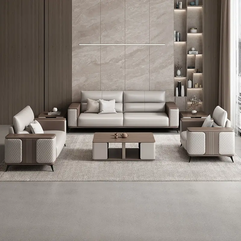 طقم كنب متكامل يجمع بين الفخامة والراحة، مصنوع من خشب زان عالي الجودة وجلد فاخر، مع طاولتي قهوة وخدمة، تصميم أنيق يناسب البيوت الخليجية.