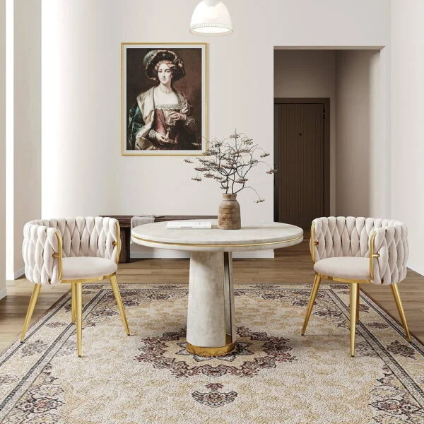 أضف لمسة من الأناقة العصرية إلى مساحة تناول الطعام الخاصة بك مع مجموعة كراسي الطعام . تتميز هذه الكراسي بتصميم ظهر دائري وجلد فاخر ، مما يضيف مظهرًا فخمًا وراحة فائقة.