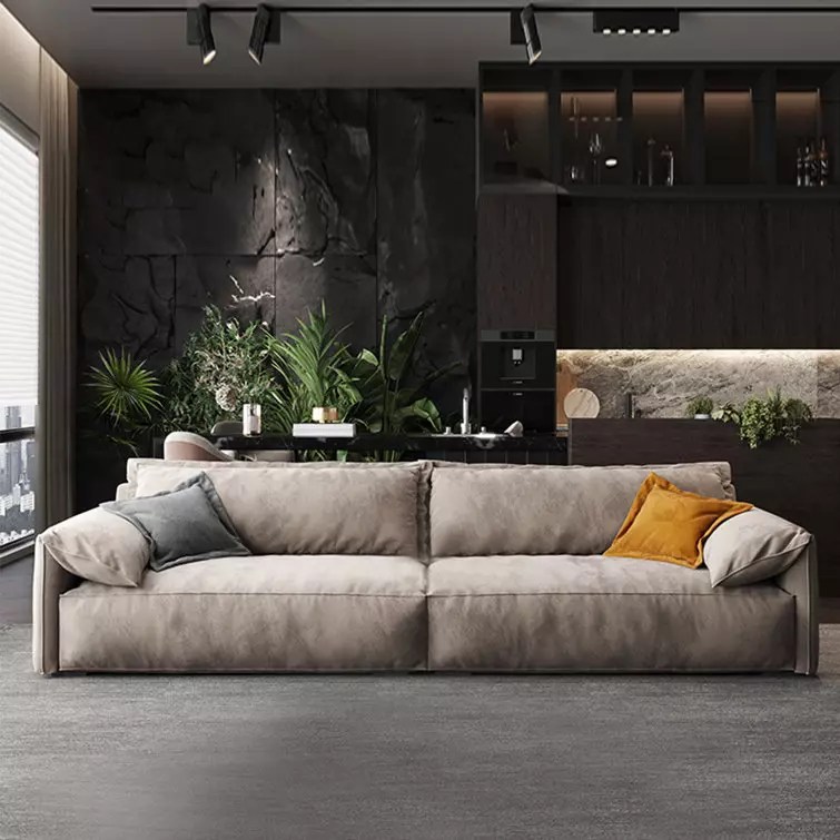 - يتميز كنب صالة مريح بألوان محايدة أنيقة تناسب مختلف أنماط الديكور مع وسائد بلون متباين تضيف لمسة حيوية جذابة.