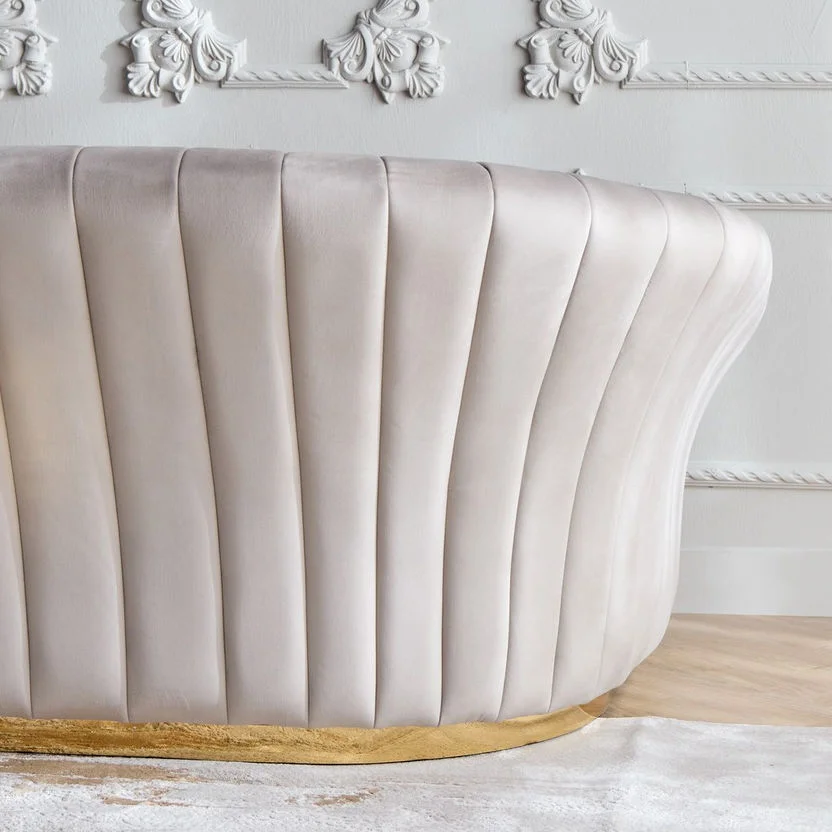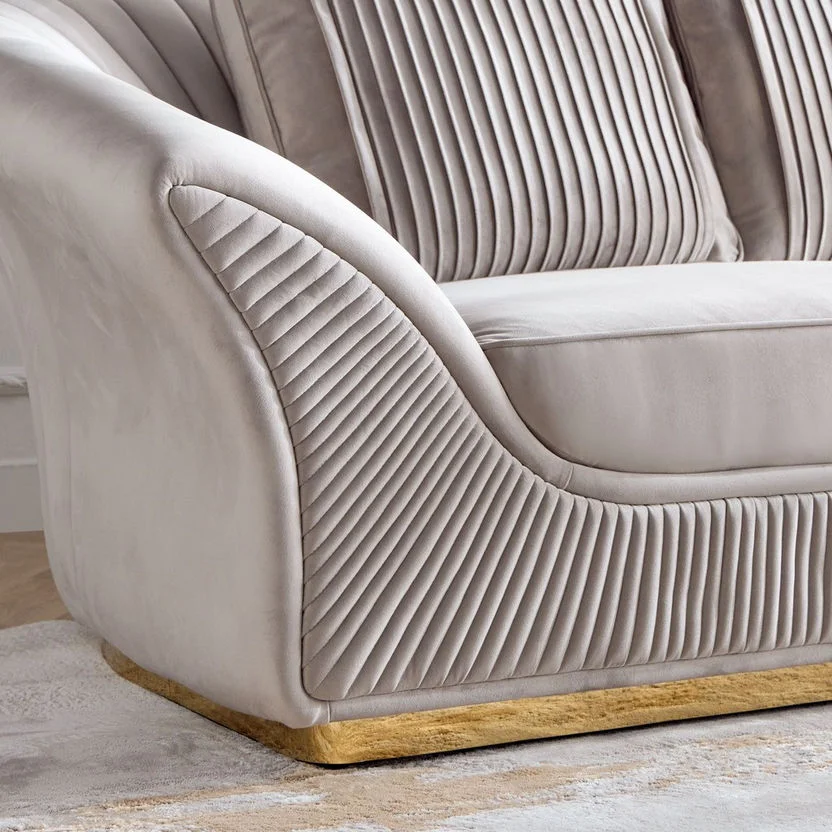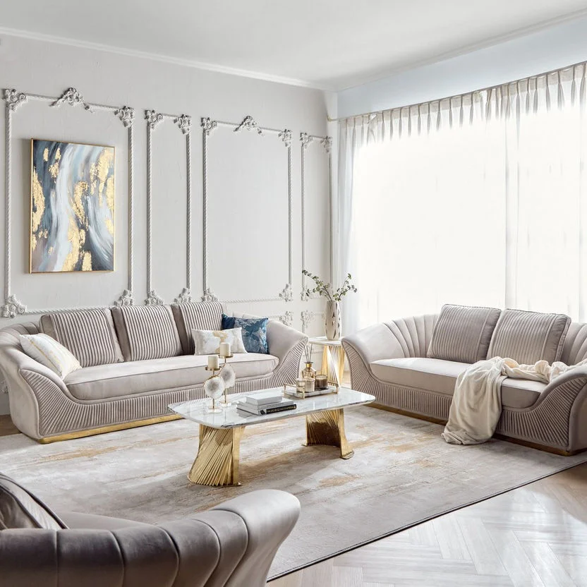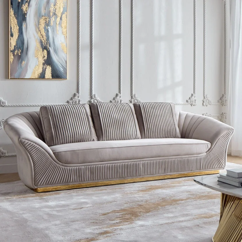 كنب مودرن بتصميم أنيق يتميز بثلاثة مقاعد، مثالي لتحسين جمالية غرفة المعيشة. يتميز بتصميم عصري ومواد عالية الجودة، ويسهم في إضفاء لمسة عصرية وأنيقة على أي مساحة. يتميز الكنب بقاعدة معدنية ذهبية مع تغطية قماشية عالية الجودة، ويتوفر بمجموعة متنوعة من الألوان ليتناسب مع ديكورات مختلفة.