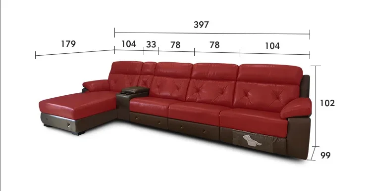 مقاس الكنب: ارتفاع المنتج (سم): 102، عمق المنتج (سم): 179، عرض المنتج (سم): 397.
