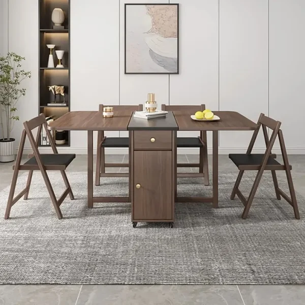 طقم عملي وأنيق لغرفة الطعام: طاولة مستطيلة قابلة للطي لتوفير المساحة، مع كراسٍ مريحة بتنجيد جلد سهل التنظيف وحشوة إسفنج لجلوس يومي مريح.