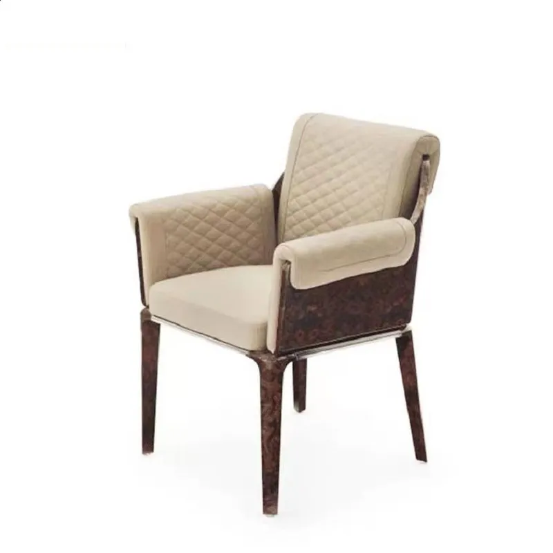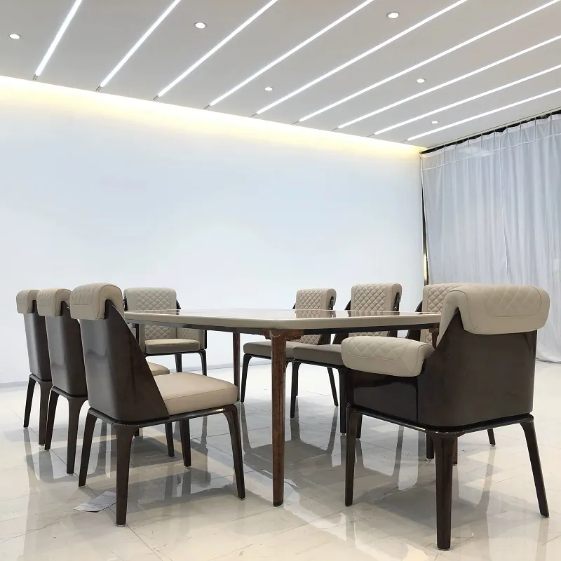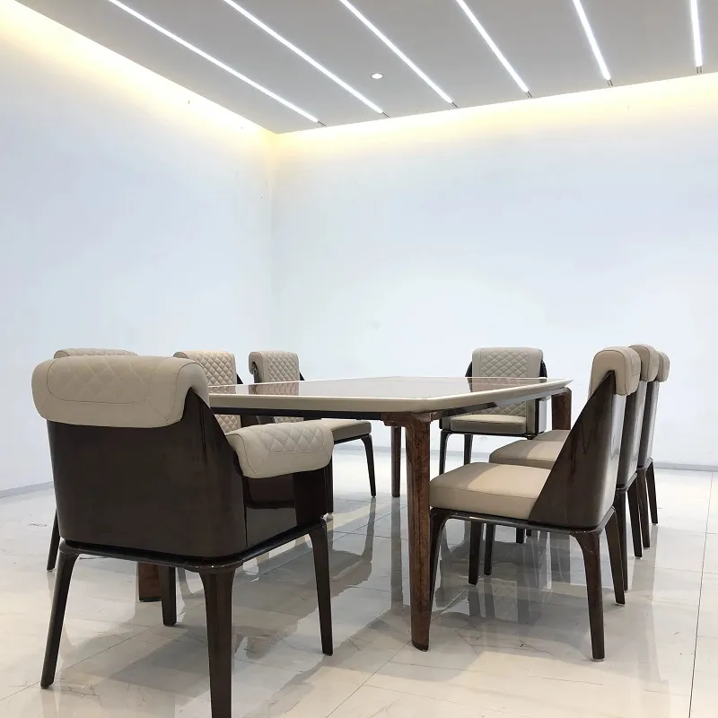 الكراسي: مصنوعة من أجود الخامات، مع تنجيد من الجلد الإيطالي الفاخر، مبطنة بإسفنج عالي الكثافة لضمان الراحة أثناء الجلوس.