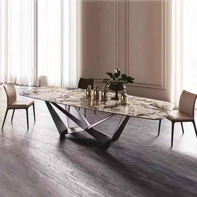 طاولة طعام رخام فخمة بقاعدة معدنية بتصميم حديث تضيف لمنزلك لمسة من الأناقة والفخامة بتصميمها العصري المميز، مصممة بقاعدة معدنية المتينة مع سطح غاية في الفخامة مصنوع من الرخام الصلب لتكون هي خيارك الأفضل لاستخدامك اليومي ونمط منزلك الحديث الفاخر مثل القصور.
