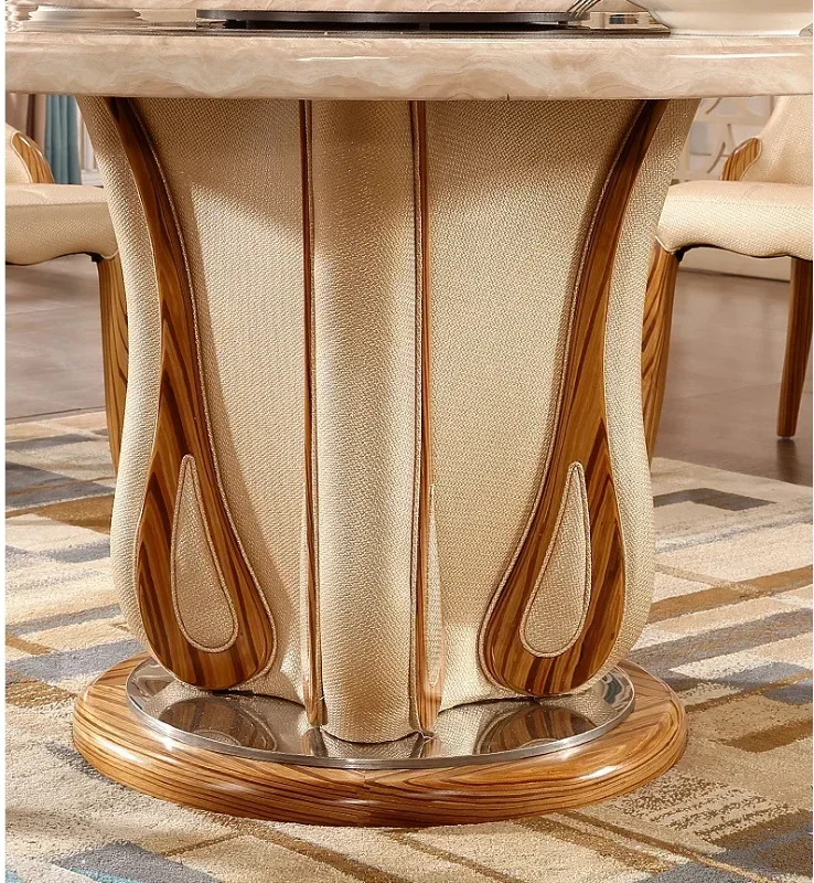 طاولة طعام رخامية دائرية مع كراسي كلاسيكية . تُصنع طاولة الطعام هذه من مزيج من الخشب الهندسي وخشب الزان الروماني عالي الجودة، مما يضمن متانتها وقوة تحملها لسنوات طويلة. كما تضفي لمسات الستيل المذهب الصلب لمسة من الفخامة على التصميم.