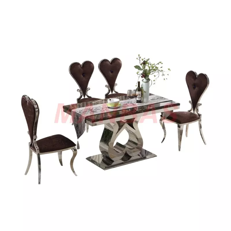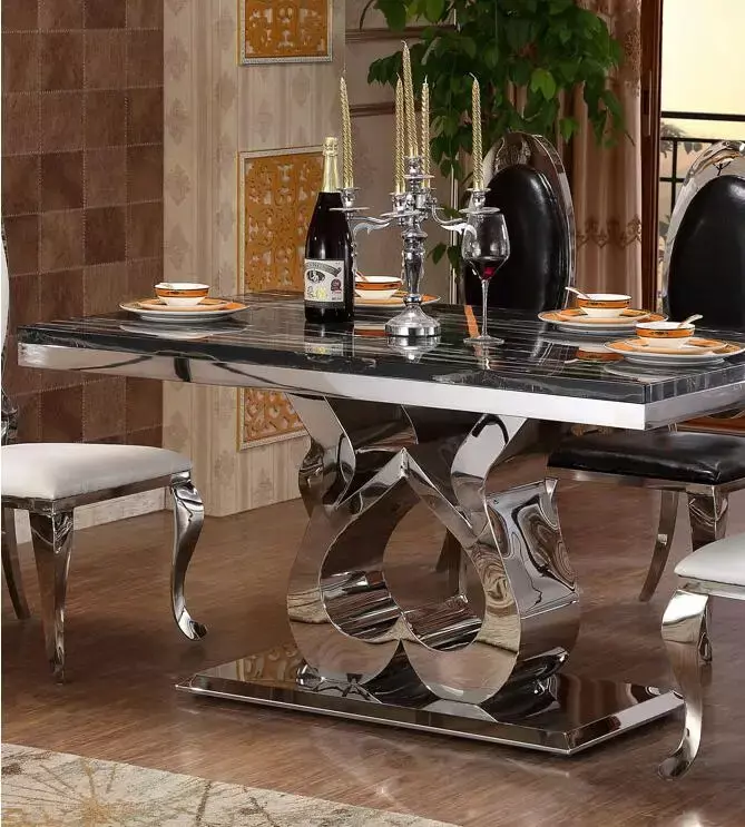 طاولة طعام رخام بتصميم كلاسيكي أنيق تضفي لمسة من الفخامة على غرفة الطعام. تتميز بسطح من الرخام عالي الجودة وهيكل معدني قوي يضمن المتانة والاستدامة. الكراسي المصاحبة محشوة بإسفنج عالي الجودة ومغطاة بجلد فاخر لراحة مثالية. متوفرة بمقاسات مختلفة لتناسب احتياجاتك. سهلة التنظيف بمسحة رقيقة فقط. تأتي مع ضمان لمدة سنتين ضد عيوب التصنيع، مما يضمن لك طمأنينة وجودة عالية. كود المنتج: MR4548.