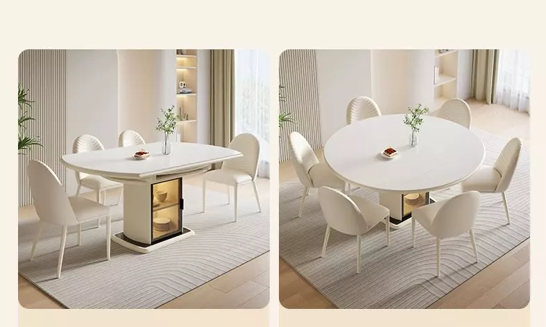 تتميز الطاولة بإمكانية تحويلها إلى شكل دائري أو مستطيل، مما يوفر لك مرونة في الاستخدام والتنسيق مع مساحة الغرفة.