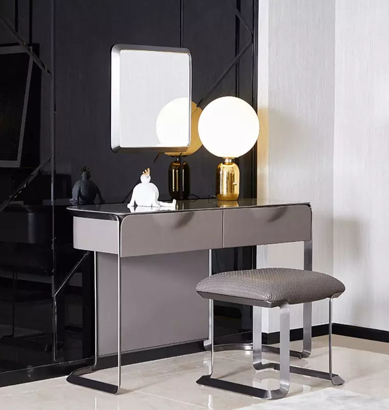 أضف لمسة جريئة لغرفتك مع تسريحة في غرفة النوم بتصميم عصري تتميز بالقوة والأناقة تأتي بقاعدة معدنية متينة تمنحها ثبات رائع ومظهر حديث مع مرآة عاكسة بإطار معدني أنيق تحتوي على درجين عمليين لتخزين الأدوات والمستلزمات اليومية بسهولة ويكتمل التصميم مع كرسي مريح بلون متناسق يضفي أنسجام وجاذبية على الغرفة، والضمان عامين ضد عيوب الصناعة.