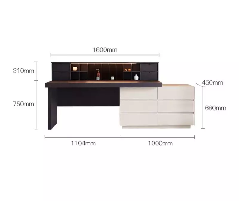 تمتاز بتصميم عصري يناسب مختلف أنماط الديكور. بفضل الوحدات المتعددة، توفر لك هذه القطعة المساحة المثالية لتخزين وتنظيم أغراضك الشخصية مثل الإكسسوارات، المستحضرات التجميلية، أو حتى الكتب. إضافة إلى ذلك، تأتي مع خزانة جانبية يمكن استخدامها لتخزين الأغراض الأكبر حجمًا مثل الملابس أو الشراشف.