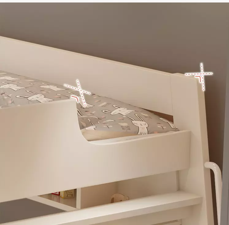 - السرير العلوي مزود بحواف مرتفعة متينة لحماية الطفل من السقوط، مع سلم جانبي ثابت ومتين يسهل الصعود والنزول بأمان تام.