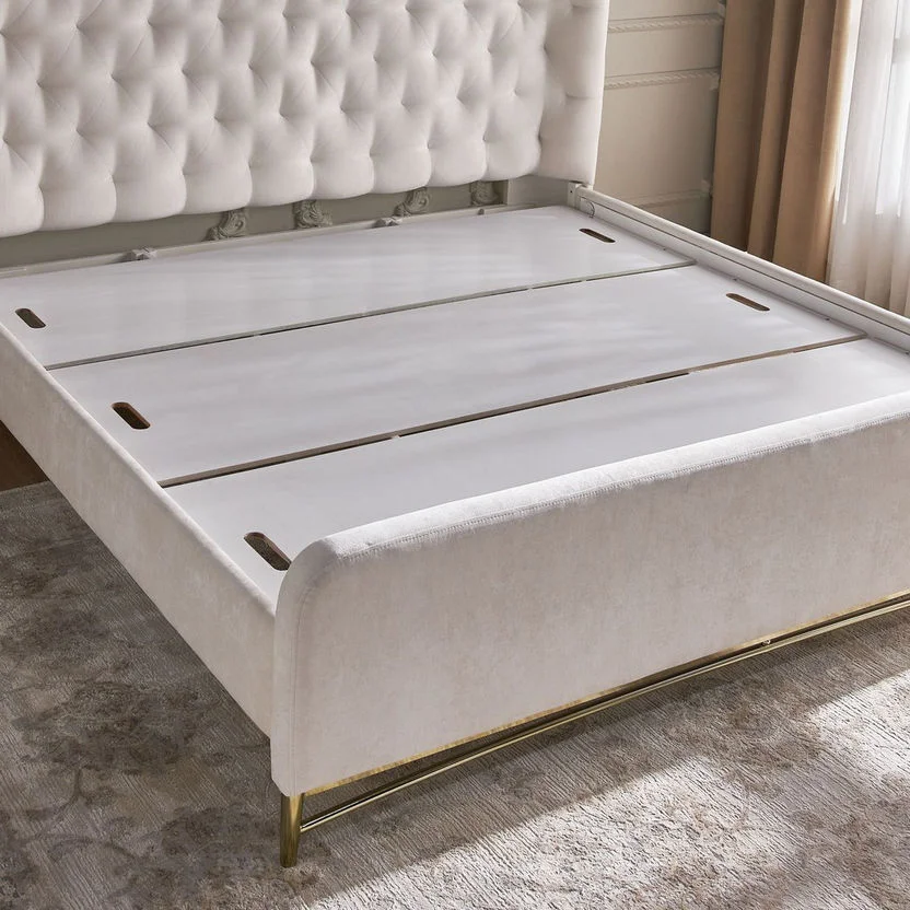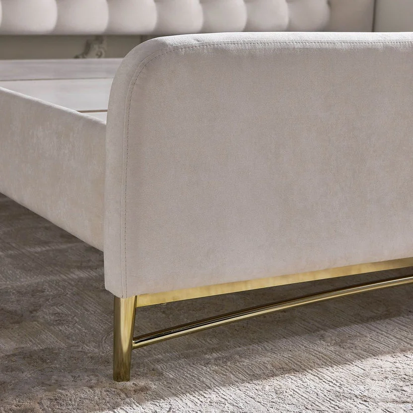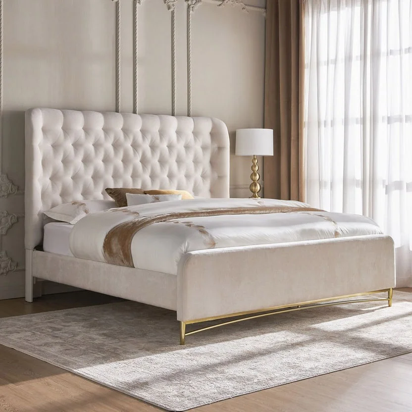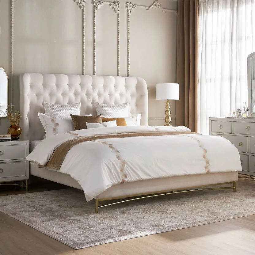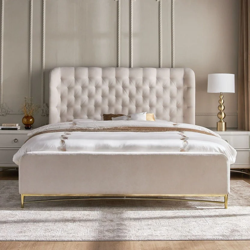متجر ماستر روم يقدم سرير غرفة نوم كينج بتصميم فخم وأنيق. مصنوع من خامات عالية الجودة بلون بيج راقي ولمسات ذهبيةـ لوح خلفي مبطن كابيتونيه يضمن الراحة والفخامة.