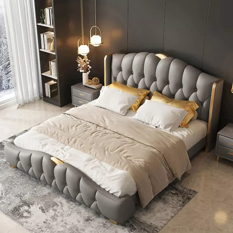 الخامات المستخدمة في تصنيع الأسرة تشمل خشب هندسي وخشب زان روماني عالي الجودة، مع إطار من الستيل المذهب الصلب المغطى بالجلد الإيطالي الفخم والمبطن بالإسفنج عالي الكثافة.