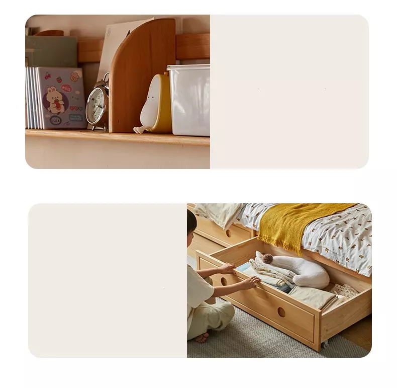هذا السرير مثالي للمساحات الصغيرة، حيث يوفر حلًا عمليًا وموفرًا للمساحة بفضل تصميمه بدورين ووجود درج لتخزين إضافي.