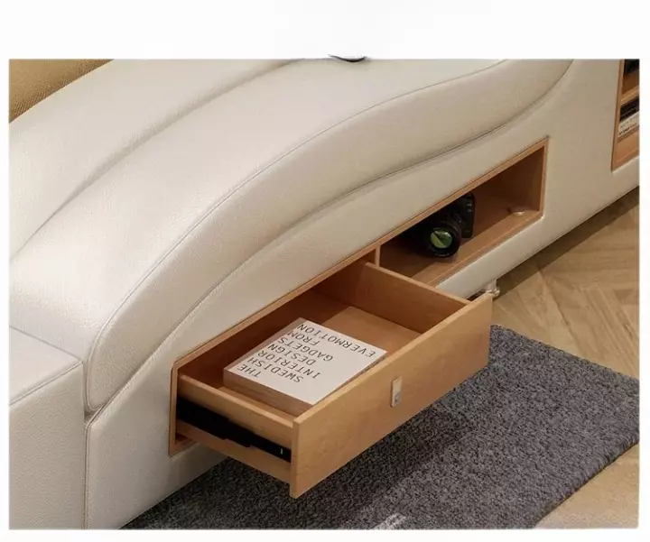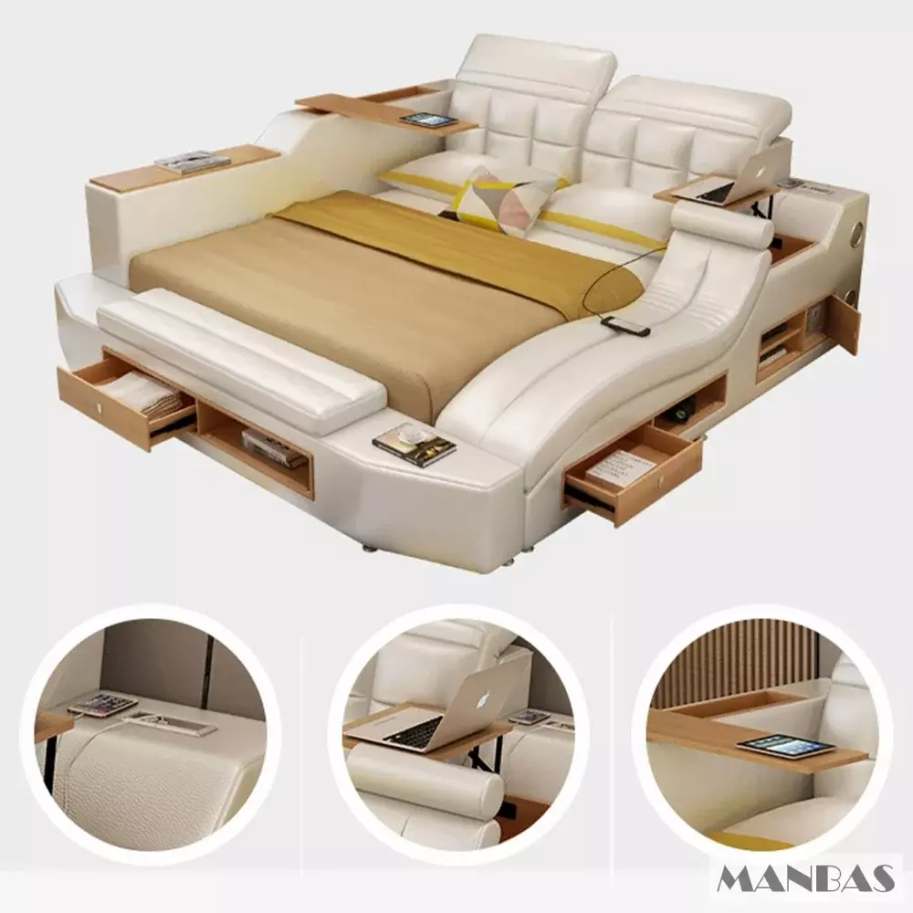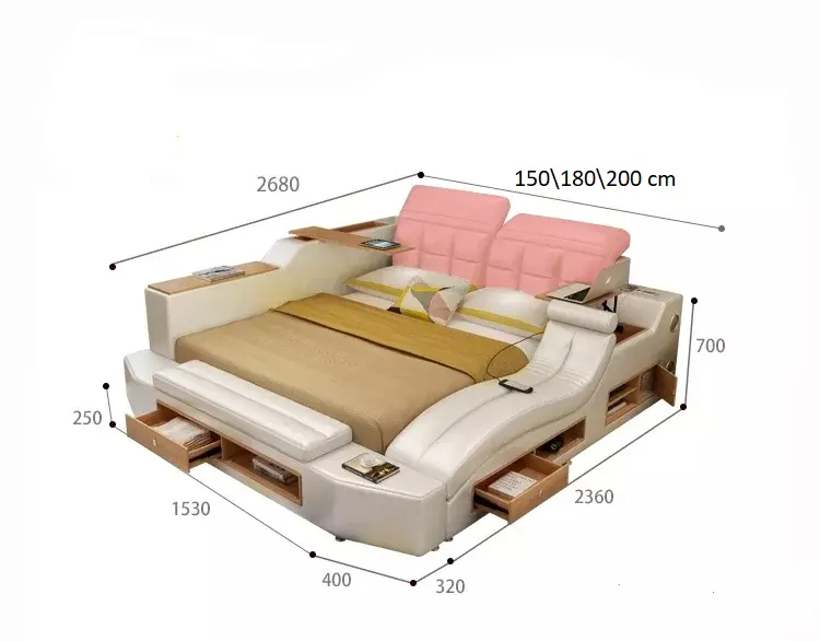 سرير النوم متعدد الوظائف يجمع بين الفخامة والعملية. مصنوع من خشب هندسي وجلد إيطالي عالي الجودة. يضم ميزات مثل شاحن USB وكرسي استرخاء وأدراج للتخزين. مسند رأس قابل للتعديل لتوفير الراحة. متوفر بمقاسات مختلفة.