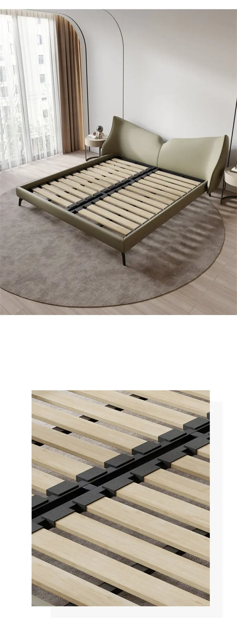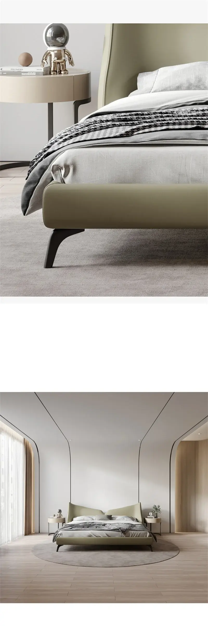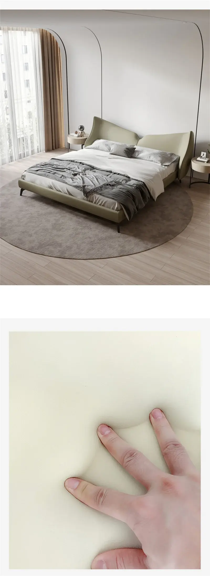 سرير دائري انيق بمميزات متعددة . مصنوع من أجود أنواع المواد، بما في ذلك هيكل من الخشب الهندسي وخشب الزان الروماني عالي الجودة، وطبقة من الجلد الإيطالي الفاخر. كما أنه مبطن بالاسفنج عالي الكثافة والمرونة ليمنحك شعوراً بالراحة والدعم أثناء النوم