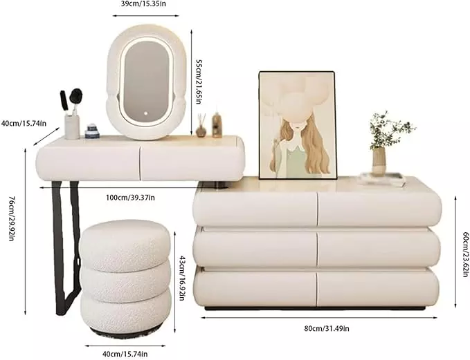 هذه الطاولة ليست مجرد تسريحة عادية؛ إنها قطعة فنية تضيف طابعًا مميزًا على غرفة نومك. تأتي مع مساحة تخزين عملية وتنظيم مثالي لمستحضرات التجميل والإكسسوارات، مما يجعلها الخيار الأمثل لمن يبحث عن الجمع بين الأناقة والراحة.
