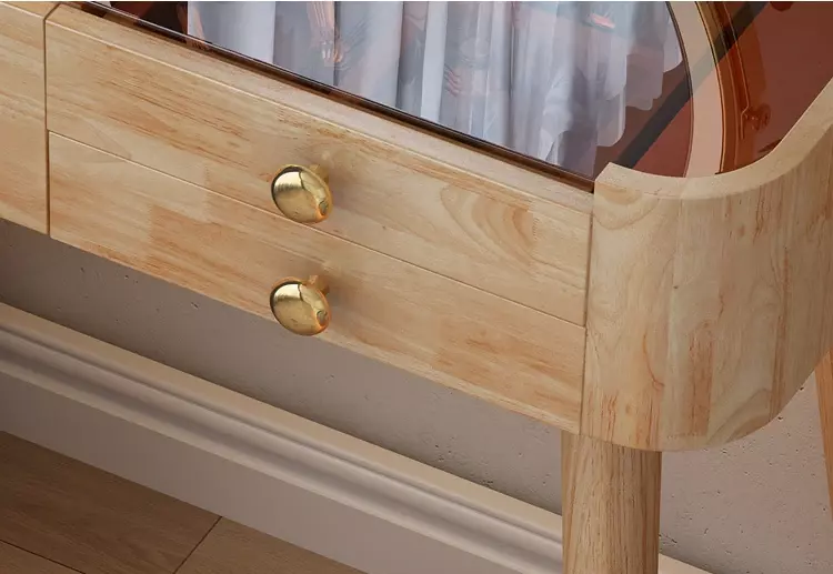 طاولة تسريحة أنيقة تجمع بين التصميم العصري والوظائف العملية. تتميز بسطح زجاجي فاخر وهيكل مصنوع من خشب هندسي وخشب زان روماني عالي الجودة. توفر مساحة مثالية لترتيب أدوات الزينة مع سهولة في التنظيف بلمسة واحدة. تأتي بلون خشبي دافئ يناسب مختلف أنماط الديكور، وهي مزودة بضمان لمدة سنتين ضد عيوب التصنيع لتوفير راحة البال. الخيار الأمثل لغرفة نومك.