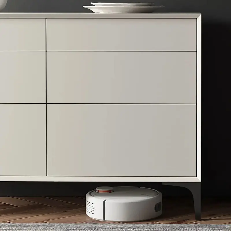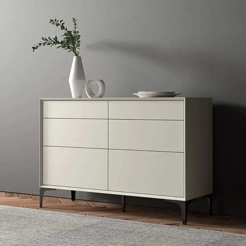 توفر الأدراج الستة المنزلقة مساحة تخزين منظمة وواسعة، مثالية لحفظ الملابس المطوية، الأكسسوارات، أو حتى مستلزمات الفراش الصغيرة. هذه الميزة تجعلها أكثر من مجرد خزانة، بل هي نظام متكامل لمساعدتك في الحفاظ على ترتيب غرفتك. كما أن تصميمها بخطوط مستقيمة وأرجل عالية باللون الأسود لا يضفي عليها فقط مظهراً عصرياً، بل يسهل أيضاً عملية التنظيف تحتها.