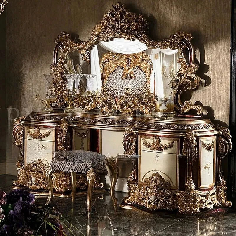 غرفة نوم كاملة فاخرة من ماستر روم بتصميم مزخرف يدويًا يمنح بيتك لمسة جمالية مميزة. مصنوعة من خشب زان روماني متين مع لمسات ستيل مذهب، وسرير مبطن بجلد إيطالي فاخر عالي الجودة. تشمل سرير، كومودينة، خزانة ملابس وتسريحة بمقاسات عملية تناسب البيت العصري. ضمان سنتين ضد عيوب التصنيع داخل دول مجلس التعاون الخليجي.