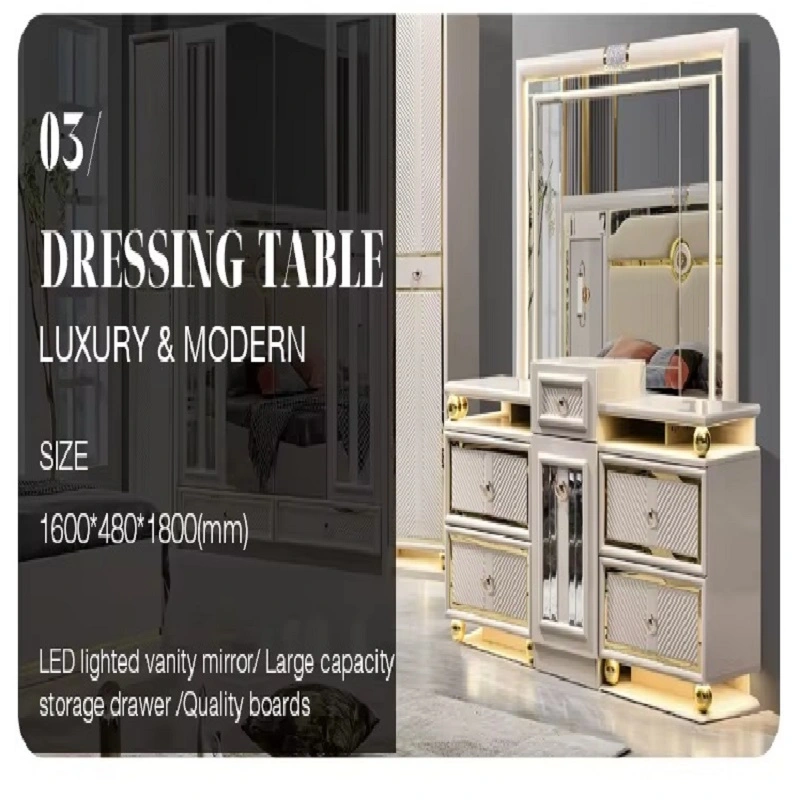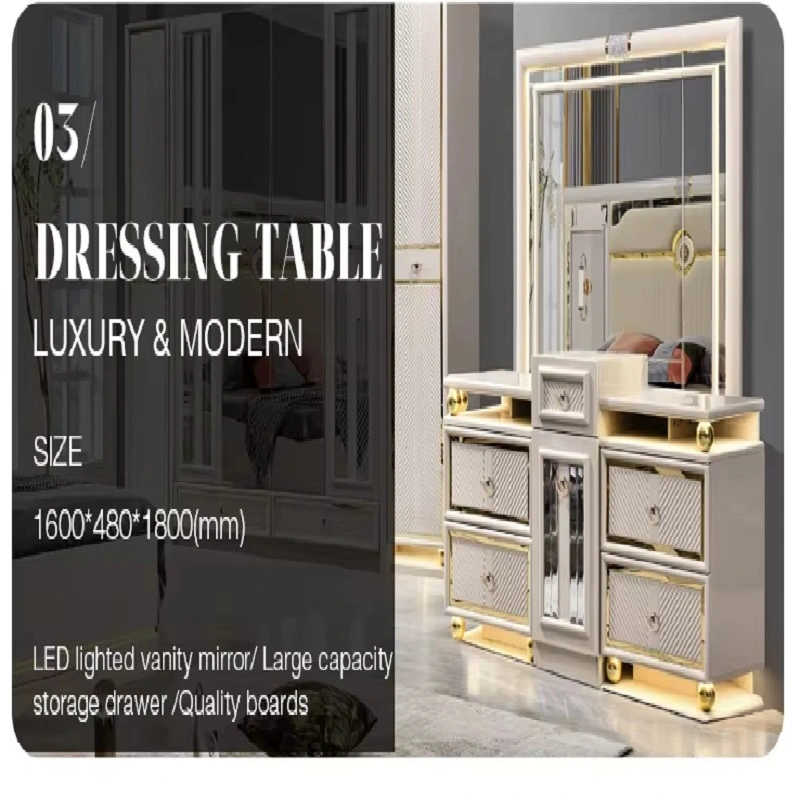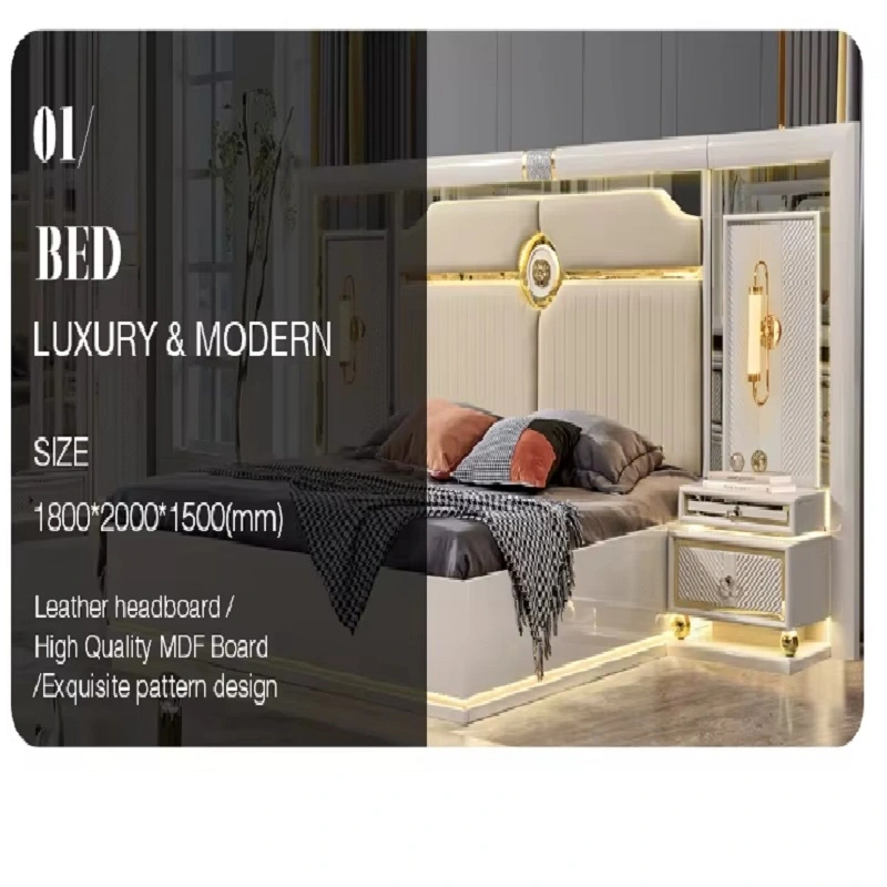 غرفة نوم كاملة بتصميم أوروبي فاخر من متجر ماستر روم، مصنوعة من خشب هندسي وخشب زان روماني عالي الجودة مع ستانلس ستيل فخم وزجاج مقوّى مقاوم للصدمات. يأتي السرير بظهر مغطى بطبقة جلد أنيق مبطّن بالإسفنج عالي الكثافة لراحة مثالية، مع خزانة ملابس واسعة، كومودينة أنيقة، وتسريحة عملية بأبعاد مناسبة. تصميم عصري يجمع بين الفخامة والمتانة مع ضمان سنتين في دول مجلس التعاون الخليجي.