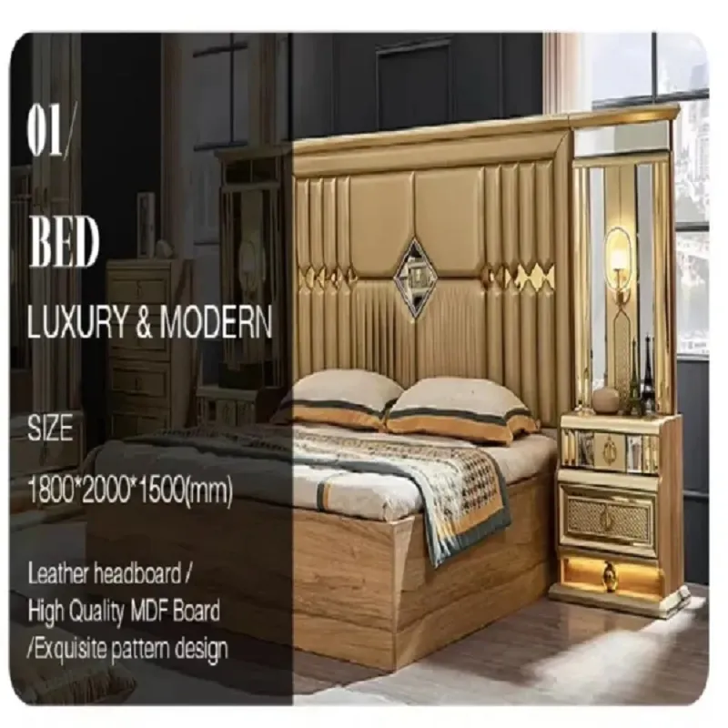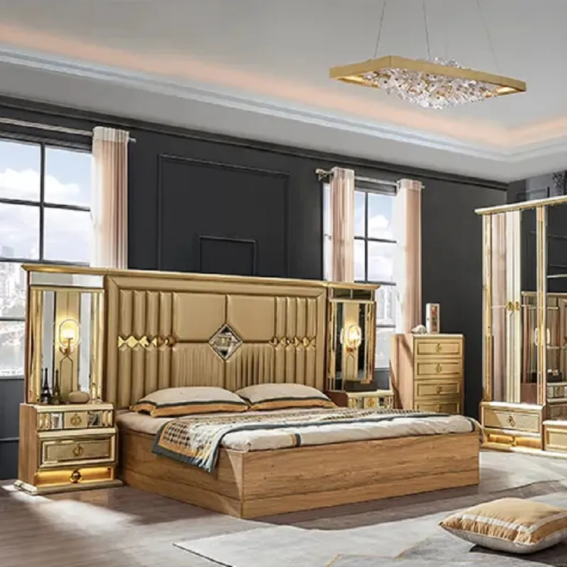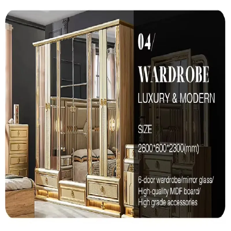 غرفة نوم كلاسيكية فاخرة من ماستر روم تجمع بين الأناقة والمتانة بتصميم راقٍ . مصنوعة من خشب هندسي وزان روماني عالي الجودة مع زجاج مقوّى وستيل مذهب متين لإطلالة ملكية تدوم. سهلة التنظيف وتأتي بضمان سنتين ضد عيوب التصنيع في دول مجلس التعاون الخليجي. فخامة التفاصيل تبدأ من غرفة نومك مع ماستر روم