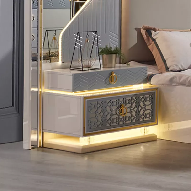 كومودينة فخمة بتصميم مميز 2026 . تتميز هذه الكومودينو بتصميمها الفخم والعصري الذي يضفي لمسة جمالية على أي غرفة نوم. مصنوعة من هيكل خشبي هندسي وخشب زان روماني عالي الجودة مع أرجل معدنية متينة وصلبة تضمن استدامتها لسنوات طويلة. تحتوي على أدراج واسعة لتخزين جميع أغراضك الشخصية.
