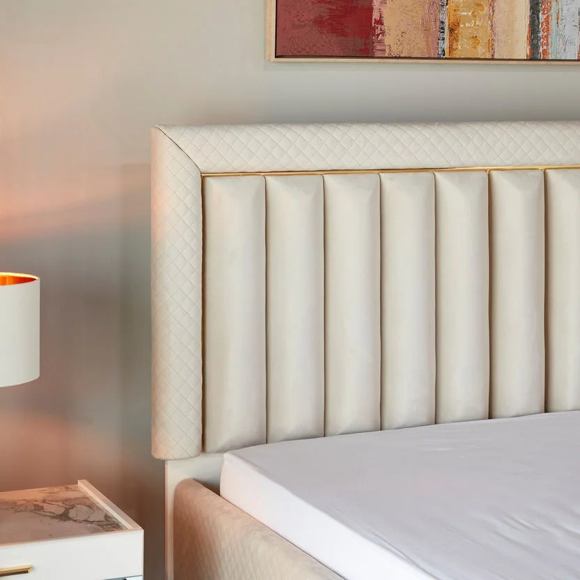سرير مزدوج بتصميم مودرن معاصر . يتكون سرير Master Room من هيكل مصنع من خشب هندسي وخشب زان روماني عالي الجودة، مع تغطية من الجلد الإيطالي المميز والناعم المبطن بإسفنج عالي الكثافة. تضمن هذه المواد راحة فائقة ودعمًا مثاليًا للظهر أثناء النوم.