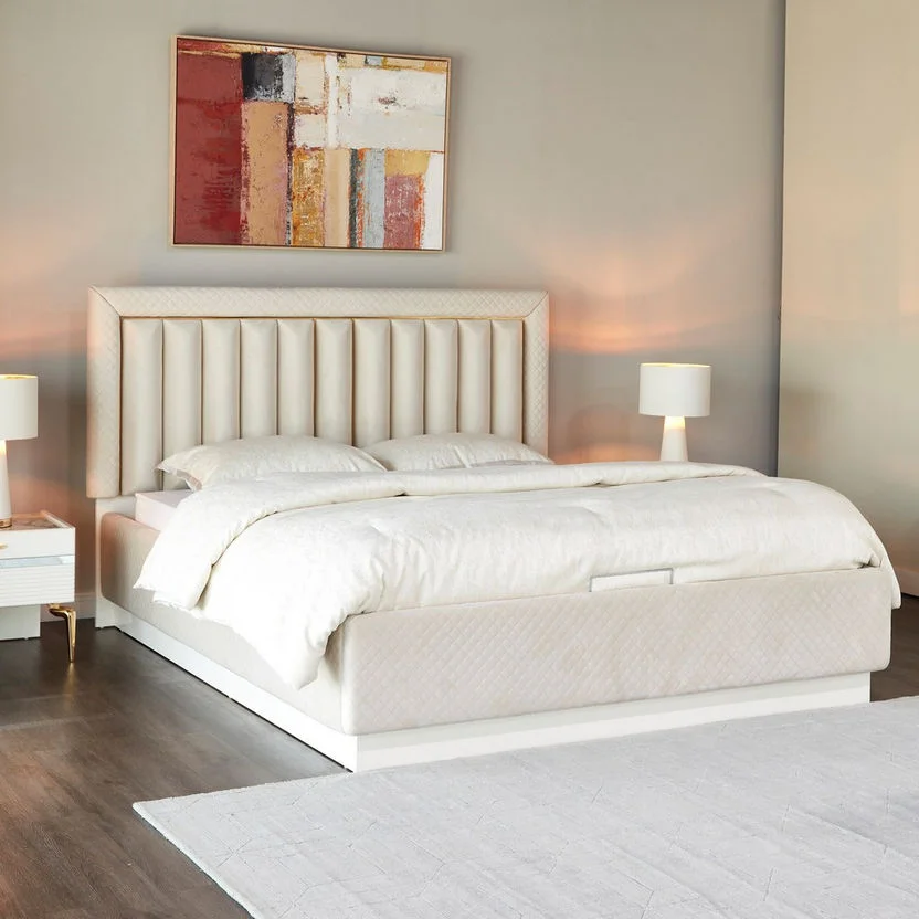 - السرير يتميز بحجمه الكبير وتصميمه المريح مع ظهر مغطى بالجلد الإيطالي الفاخر ومبطن باسفنج عالي الكثافة يكمل فخامة التصميم.