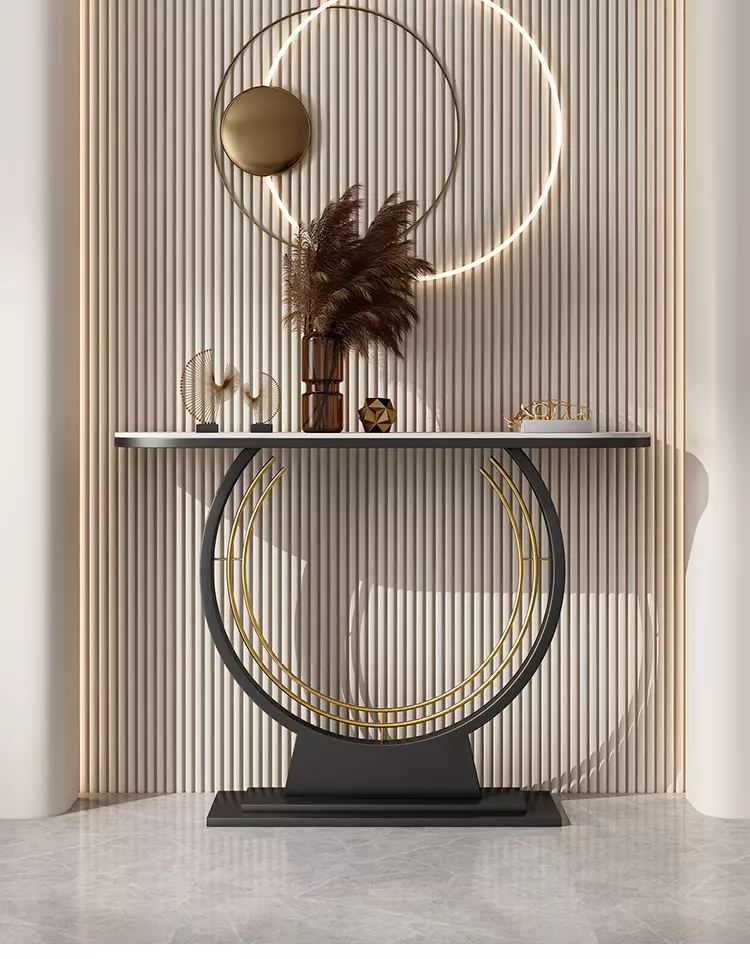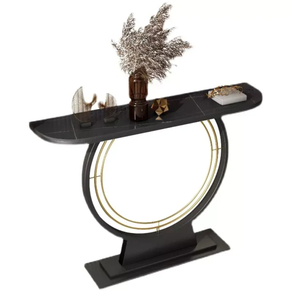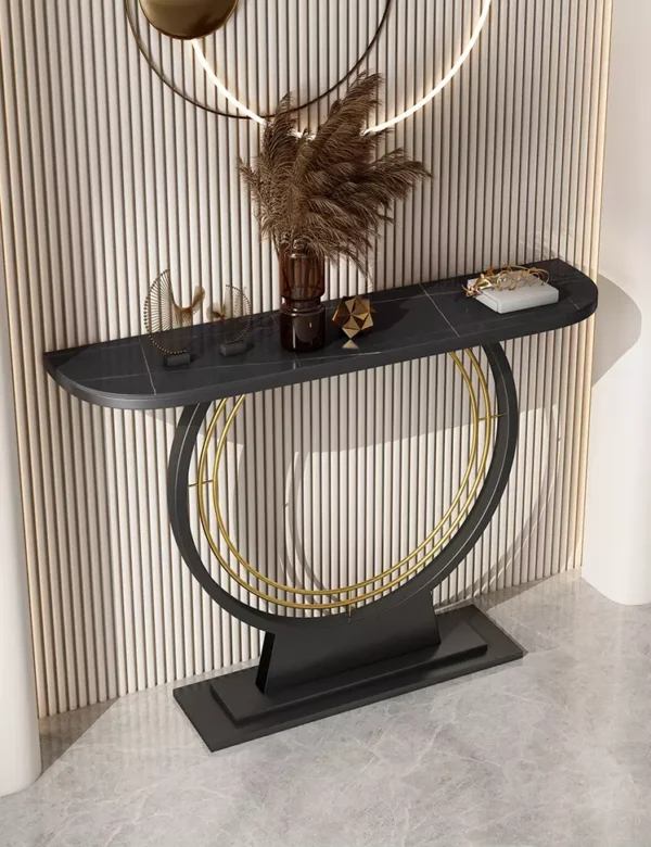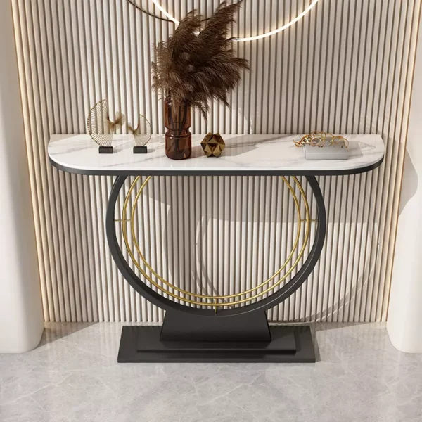 يأتي هذا الكونسول بقاعدة معدنية قوية بشكل دائري، مما يضيف لمسة فنية وعصرية على تصميمه. سواء اخترت السطح باللون الأبيض أو الأسود، فإنه سيضيف جاذبية ورقي إلى أي مساحة يوضع فيها.