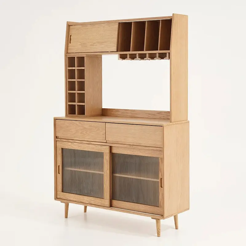 أدراج متعددة مناسبة للأدوات الصغيرة مثل الملاعق والشوك وأدوات التقديم. أبواب منزلقة تسهّل الحركة في المساحات الضيقة وتبقي الشكل العام هادئًا ومرتبًا. رف مخصص للقوارير بعدة فتحات لتنظيم زجاجات المشروبات أو العبوات بشكل أنيق بدل تكديسها داخل الخزانة.