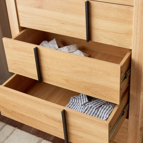 وحدة تخزين أنيقة بطراز اسكندنافي عصري، مصنوعة من خشب زان متين عالي الجودة، بلون خشبي طبيعي يمنح الغرفة دفئًا، وبمقاسات عملية تناسب غرف النوم والممرات، مع ضمان لمدة سنتين في السعودية ودول الخليج.
