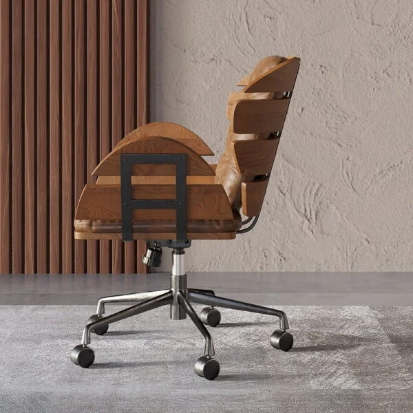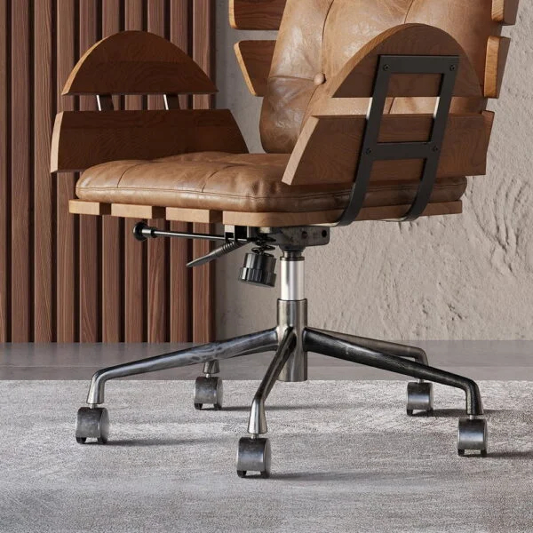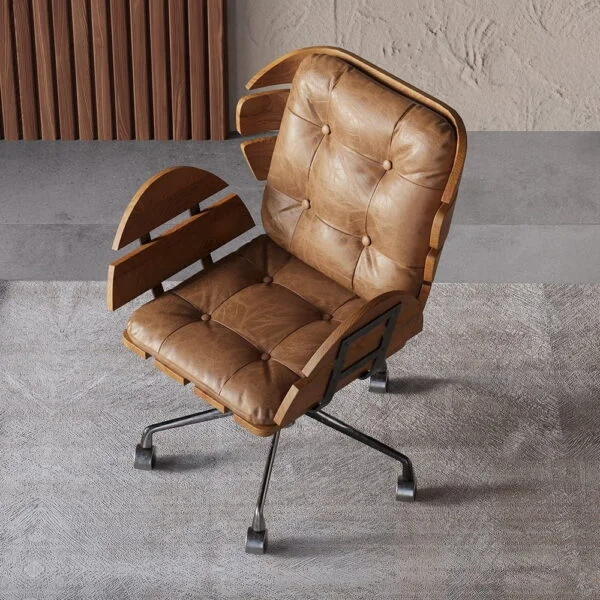 كرسي مكتب مريح دوار بتصميم فريد ومميز يجمع بين الأداء المريح والمظهر الاحترافي، مصنوع من خشب زان متين عالي الجودة ومعدن قوي ليلائم بيئات العمل ، مع تنجيد جلدي يضمن سهولة العناية به.