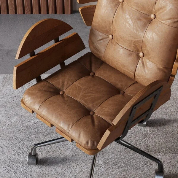 تم تغليف الكرسي بتنجيد من جلد عالي الجودة، ويتميز هذا الجلد بمظهره الأنيق وملمسه الناعم، إضافة إلى عمره الطويل ومقاومته للتآكل. المقعد محشو بإسفنج عالي الجودة يوفر دعماً مريحاً ومستداماً. يتميز الجلد بسهولة العناية به وتنظيفه، حيث يمكن مسحه بقطعة قماش رقيقة عند الحاجة، وهو ما يجعله عملياً جداً في بيئات العمل المشغولة. تأتي الخطوط الطولية والدرزات المتقنة كعنصر تفصيلي يعزز المظهر الاحترافي والمصقول للكرسي.