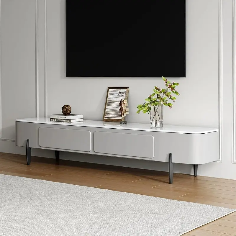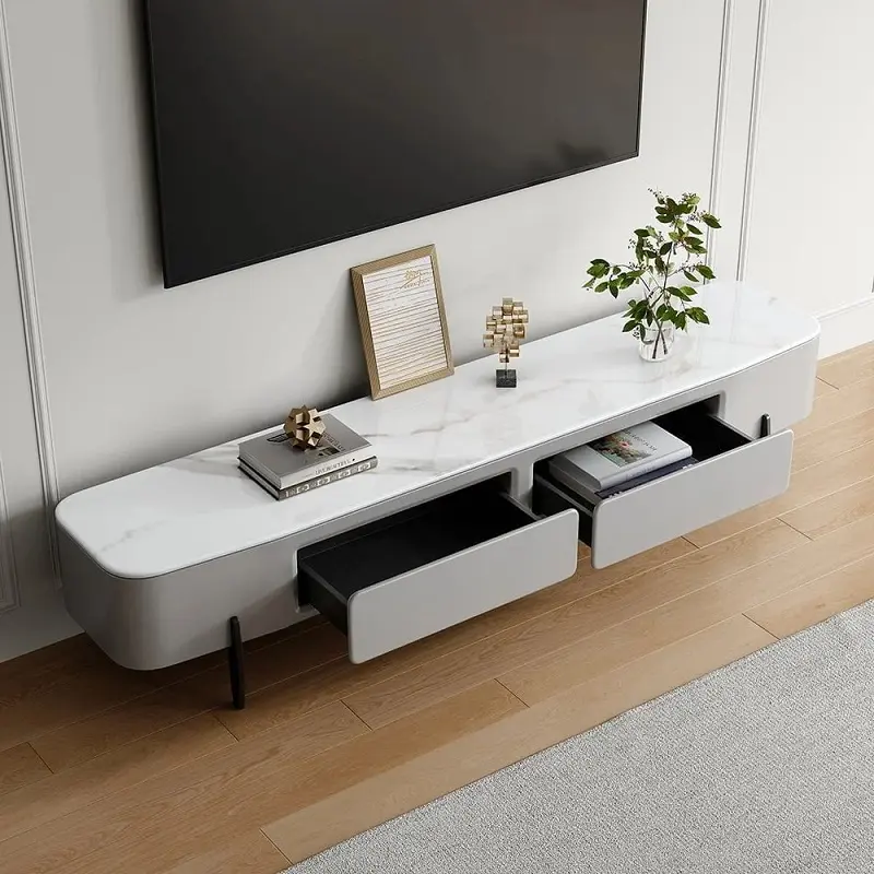 طاولة تلفاز تجمع بين المظهر الفاخر والمساحة التنظيمية الذكية، مصنوعة من خشب عالي الجودة مع سطح رخامي لتناسب البيوت العصرية في السعودية، وتوفر عناية سهلة.