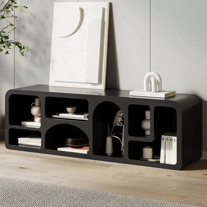 يبرز جمال هذه الطاولة في أرففها غير المتناسقة التي تتبع نمطاً هندسياً جريئاً، حيث توفر مساحات عرض متنوعة تكسر جمود الأثاث التقليدي. تم تصميم القطعة بعرض يصل إلى 160 سم، مما يجعلها قاعدة مثالية لاستيعاب شاشات التلفاز الكبيرة التي تصل إلى 70 بوصة، بينما يبلغ عمقها 40 سم وارتفاعها 51 سم، وهي مقاسات مدروسة بدقة لتوفير رؤية مريحة للعين وتوزيع متوازن للقطع الجمالية والكتب داخل الأرفف المفتوحة.
