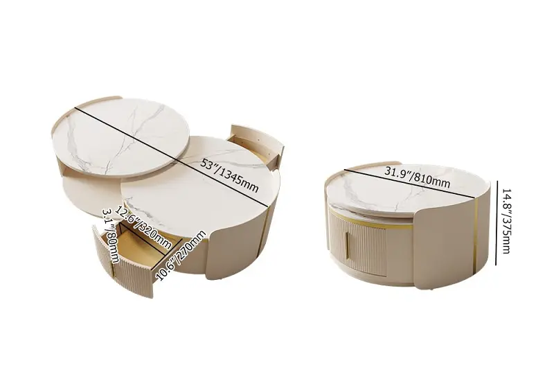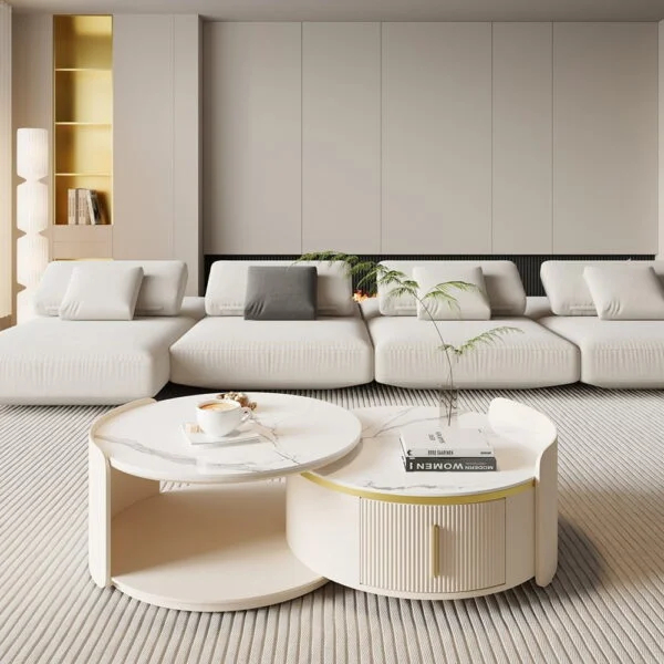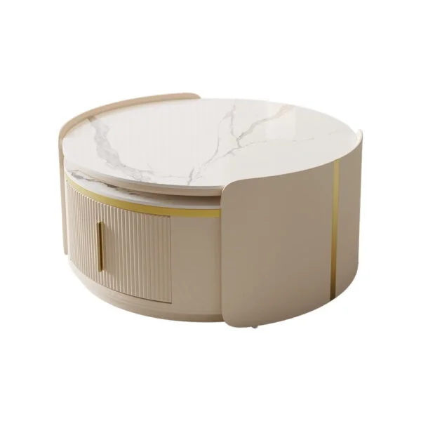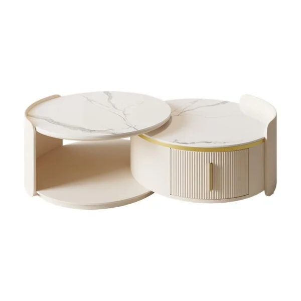 طاولة قهوة تجمع بين الفخامة والعملية بتصميم دائري مبتكر، مصنوعة من خشب زان متين عالي الجودة مع سطح رخامي، مناسبة للبيوت الحديثة بفضل سهولة العناية والتنظيف.