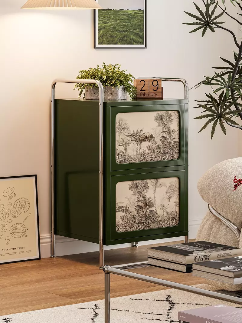 A sturdy, modern serving table adds a practical and elegant touch to your living room. Made of high-quality engineered wood and beech wood with a sturdy metal base, it's available in attractive colors including black, light green, and green with a leaf pattern. Ideal for serving drinks or arranging décor, it features practical dimensions and is easy to maintain. It comes with a two-year warranty against manufacturing defects for the Gulf countries.