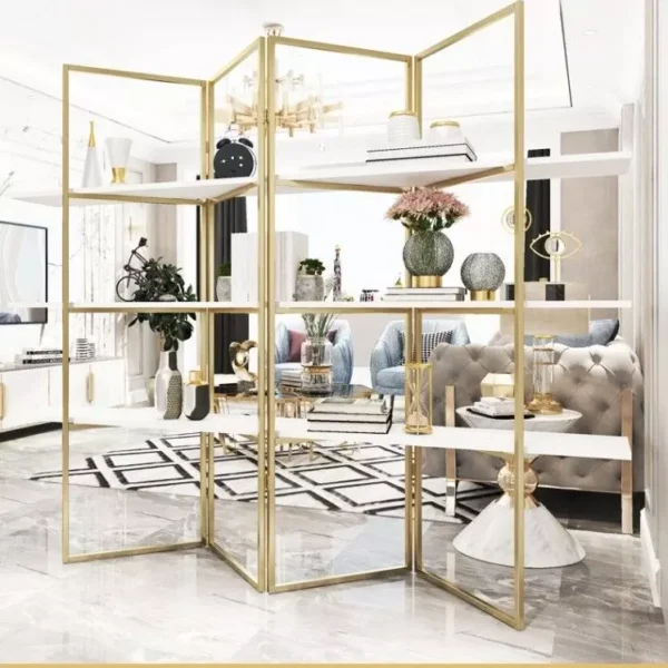 Modern Curved Partition Add a touch of elegance and distinction to your living room with this contemporary partition. Featuring a unique curved design, it combines a sturdy metal frame with shelves made of high-quality engineered wood and Roman beech wood. Available in a gold finish with white shelves, it's easy to clean with a simple wipe and a simple pressure. It comes with a two-year warranty against manufacturing defects in the GCC. Get this distinctive partition now.
