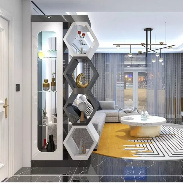 Add an aesthetic and functional touch to your living room with a wooden partition with shelves featuring a distinctive design. The partition features high-quality engineered wood and Roman beech, ensuring long-lasting durability and stability. It features ideal dimensions, is easy to clean, and comes with a two-year warranty against manufacturing defects in the GCC.