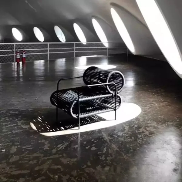 - كراسي حديد مودرن خارجية تتميز بتصميم فريد وعصري يخطف الأنظار بشكل خشب الروطان المفرغ الفاخر.
