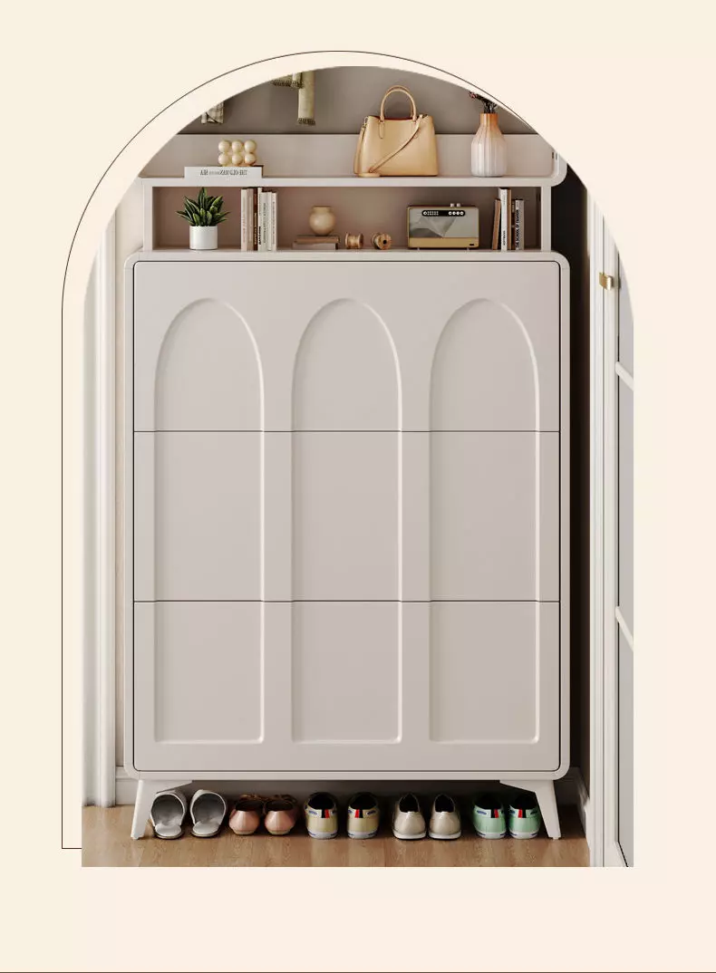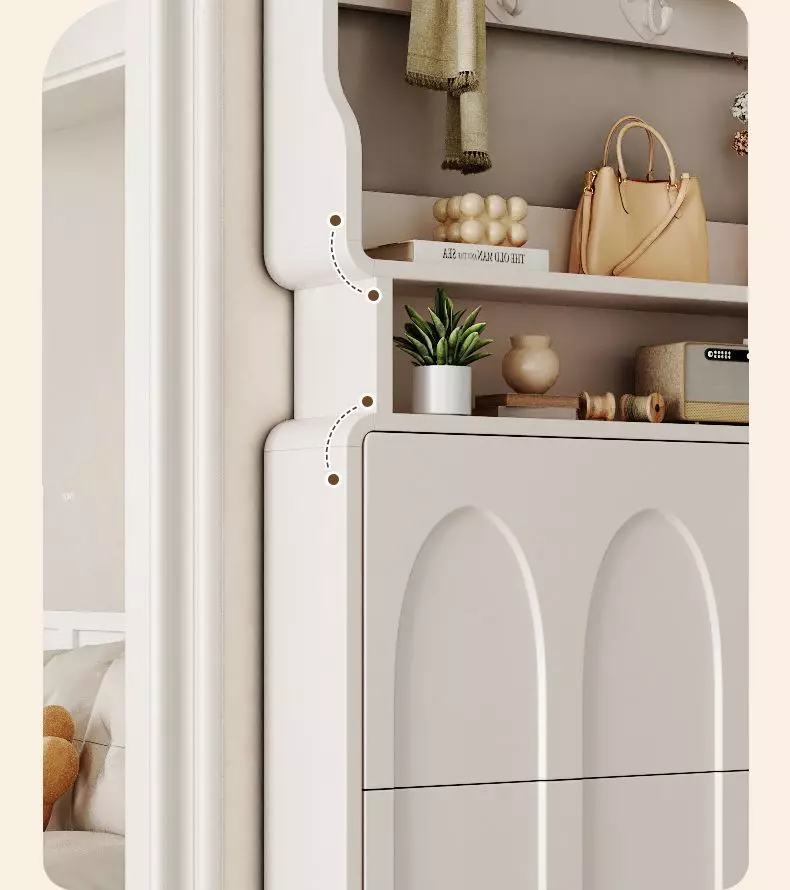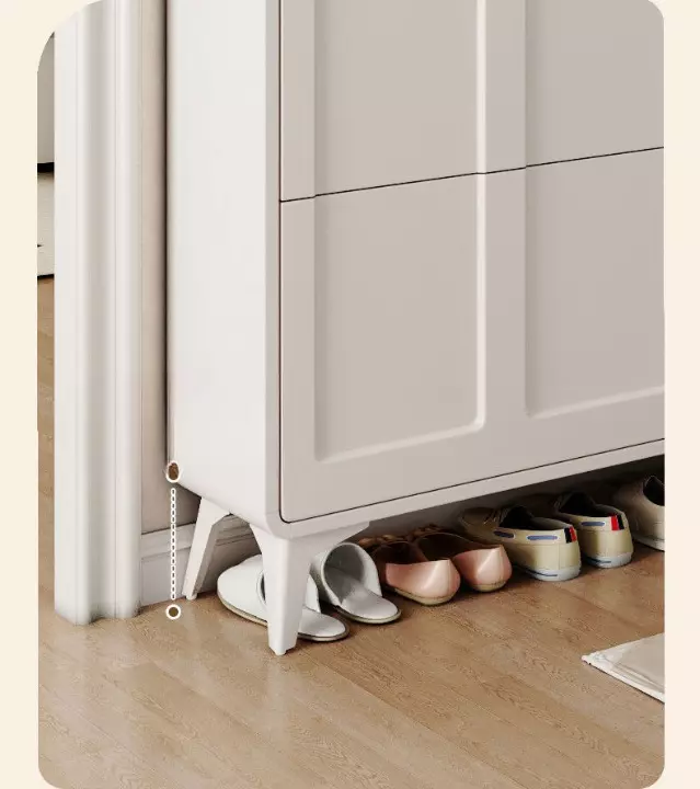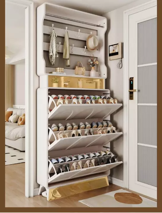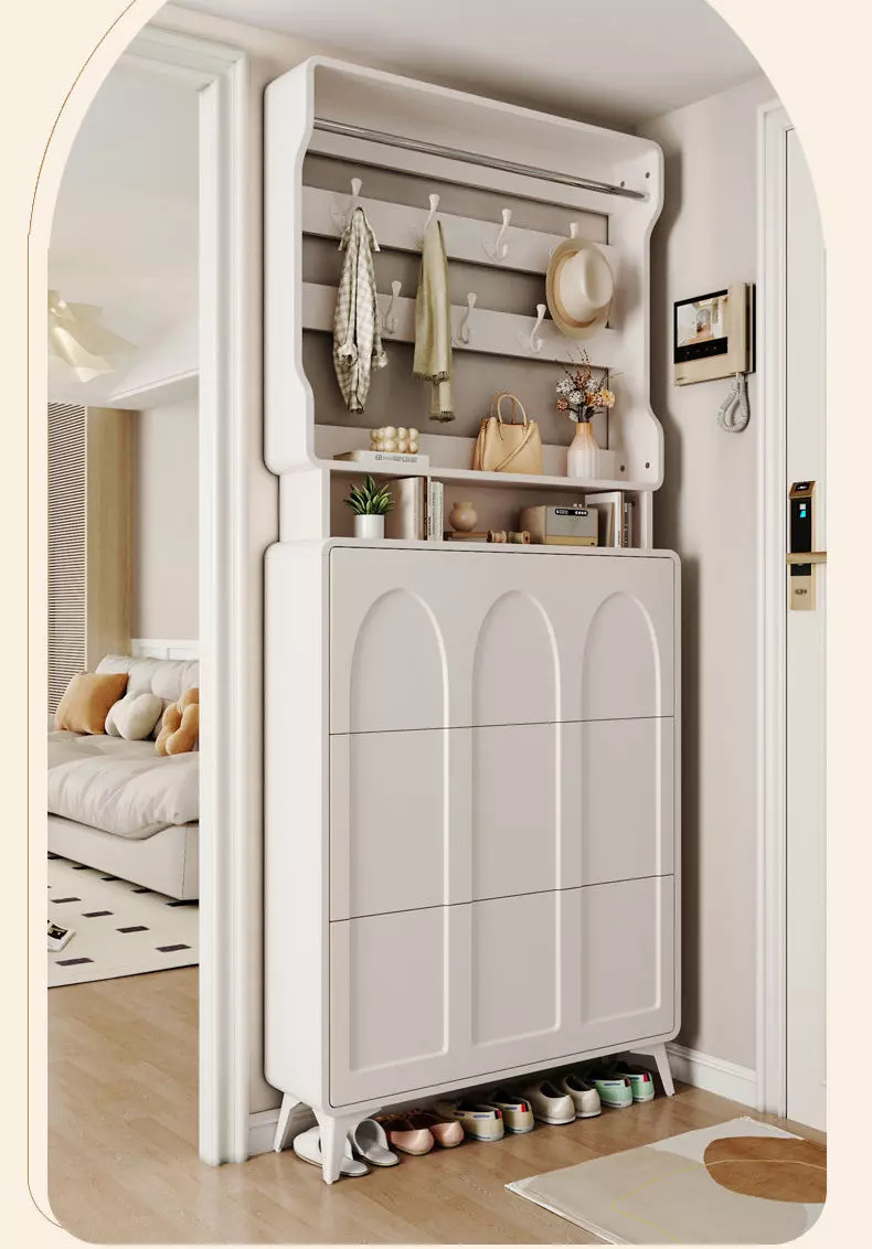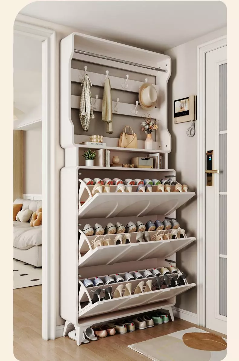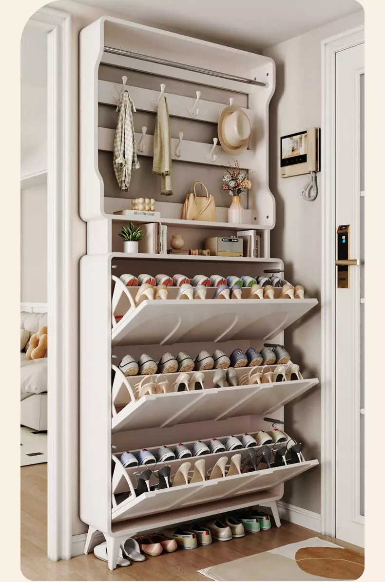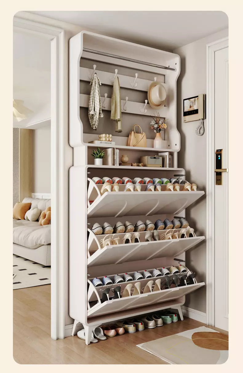 تأتي خزانة الأحذية مع علاقة ملابس، مما يجعلها متعددة الاستخدامات. يمكنك استخدامها لتنظيم الأحذية، إضافة إلى تعليق الملابس أو المعاطف بطريقة مرتبة وأنيقة. هذا التصميم المودرن ليس فقط عمليًا، بل أيضًا يضيف لمسة من الفخامة على غرفة المعيشة أو المدخل.